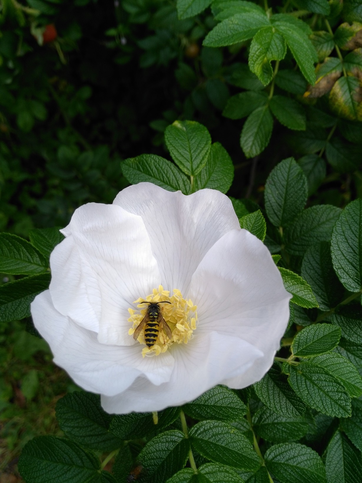 Olin kauppareissulla ja huomasin tuon ruusunkukassa poseeraavan ampiaisen.
