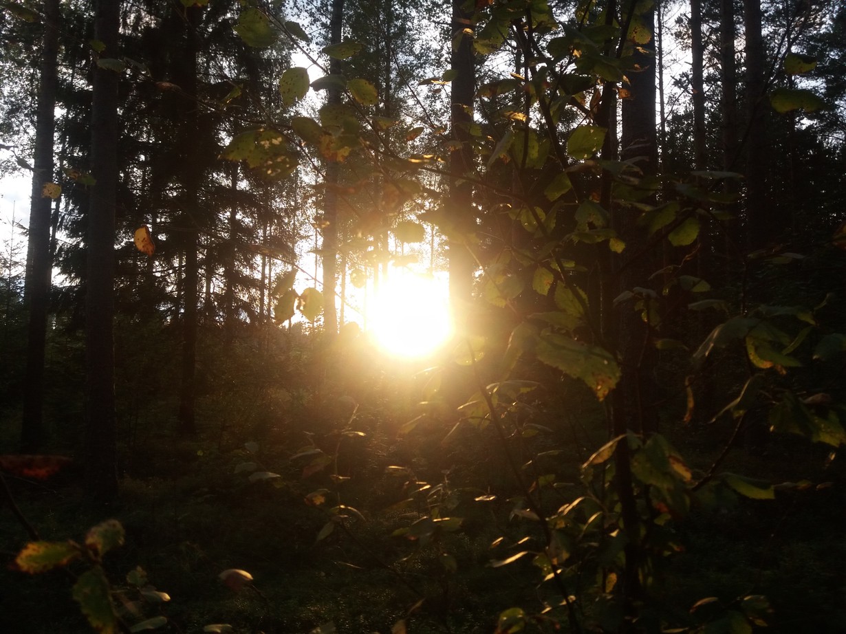 Tämä kuva on otettu elokuussa-16 Koski Tl:ssä. Kuljen mieheni ja koirani kanssa usein metsässä ja kuvailen mm.auringonlaskuja ? Tässä kuvassa auringonsäteet kurkistelevat mukavasti puiden lehtien takaa.