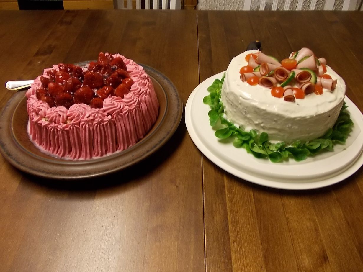 Mansikkakakku sisältää mansikkamoussea ja oikeita mansikoita.Voileipäkakku on gluteeniton ja laktoositon kinkkuvoileipäkakku.samalla kun juhlimme koulun lopettajaisia,niin on syntymäpäivät käsillä.