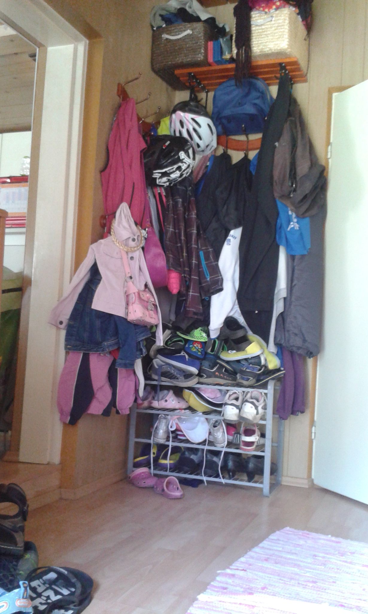 Meidän eteinen on aina aivan pommin jäljiltä, tosin juuri kuvanottohetkellä näyttää lasten kengät kerrankin olevan telineessä. =D Se on auttamattomasti liian pieni ja sille asialle ei voi mitään, mutta jos jotain muita vinkkejä saisi miten siellä pysyisi järjestys niin olisin todella kiitollinen! =)