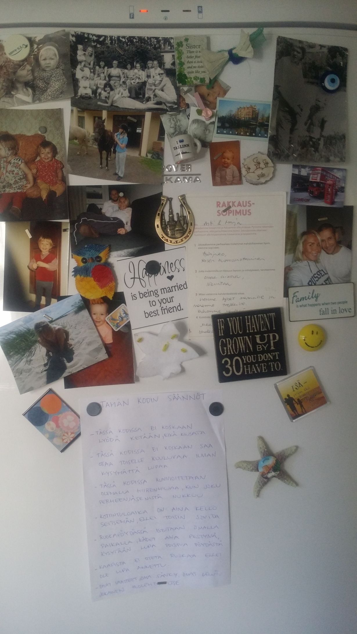 Meidän jääkaapin ovessa on aina ollut kuvia perheenjäsenistä ja minun isästä joka ei koskaan päässyt näkemään lapsenlapsiaan. Säännöt on aina hyvä kerrata 4 lapsen perheessä unohtamatta perheen aikuisten omaa rakkaussopimusta. Toivon että kodistamme lähtee maailmalle uteliaita ja omatoimisia itseään rakastavia lapsia.