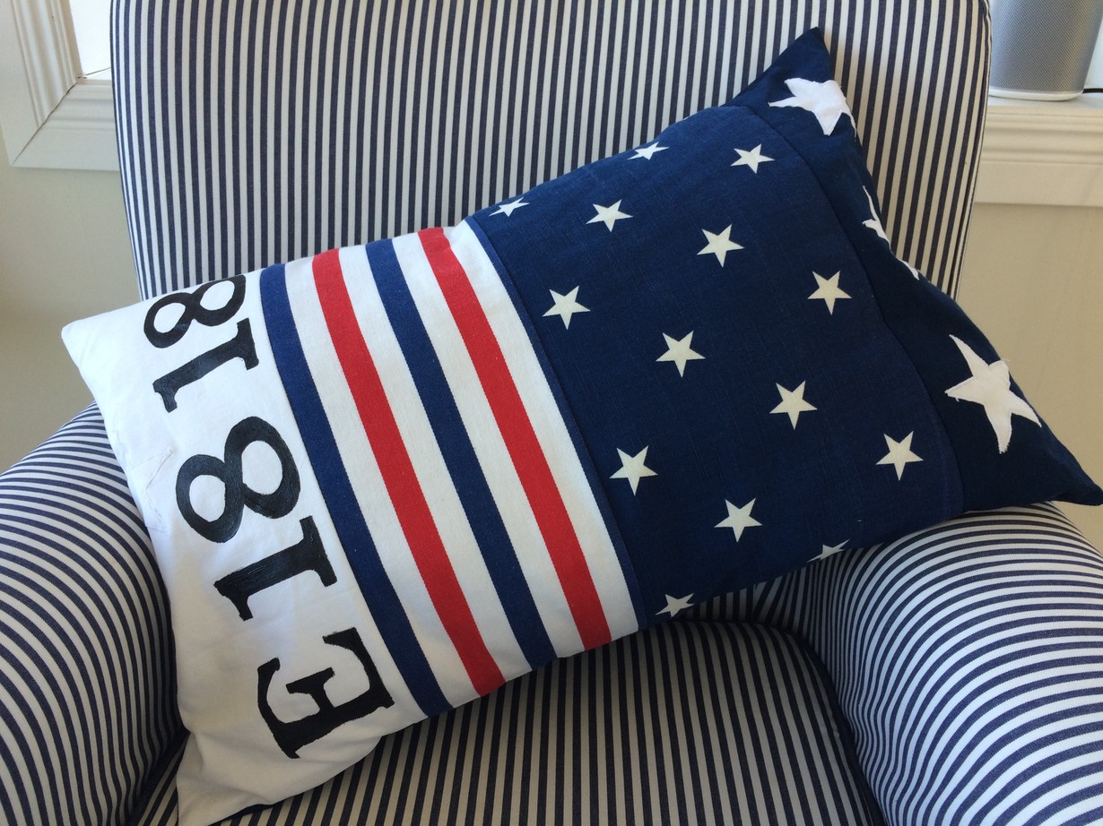Ompelin 6 samantyylistä tyynyä ulkoterassilla olevalle pitkälle puupenkille. Tyynyt ovat kaikki vähän erilaisia, mutta olen käyttänyt samoja kankaita. Tässä kuva yhdestä tyynystä. Koordinaattii on maalattu tekstiilivärillä ja shabloonalla. Kankaat eri kauppojen palalaatikosta.