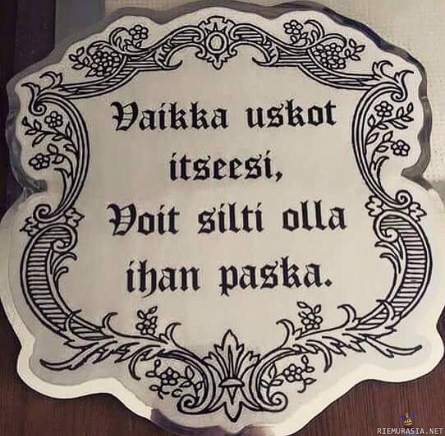 Kuvaa kotona näkyvä mietelause - voit voittaa Nespresson kahvikoneen Mietelause (137/156) Jone klo 12:16 | 9.5.2017 Ilmoita asiattomaksi Huumorilla huumorilla:) FacebookTwitterWhatsApp Tallenna Tykkää (3) Tämä ihana arki Tämä ihana arki Kuvaa kotona näkyvä mietelause - voit voittaa Nespresson kahvikoneen Lähetä kuva!