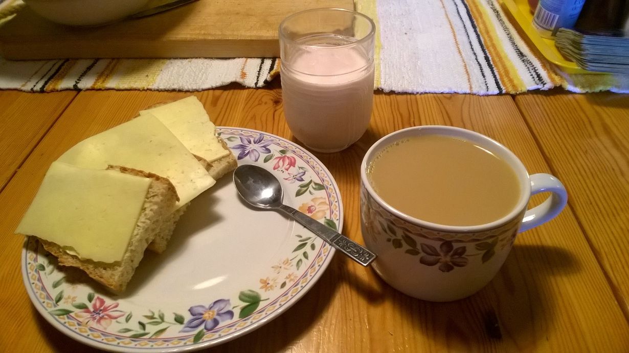 Kuva on menneeltä syksyltä, mutta arkiaamiaiseni pääsisältö on AINA sama: juustoleivät, jugurtti ja kahvi. Kotona leivät (2 kpl) kuuluu olla paahdettuja. Kuvan tapauksessa leivät ovat umpi-ihanaa Tuulosrievää! Nam. Ja siksi leipäpaloja onkin kolme! =)