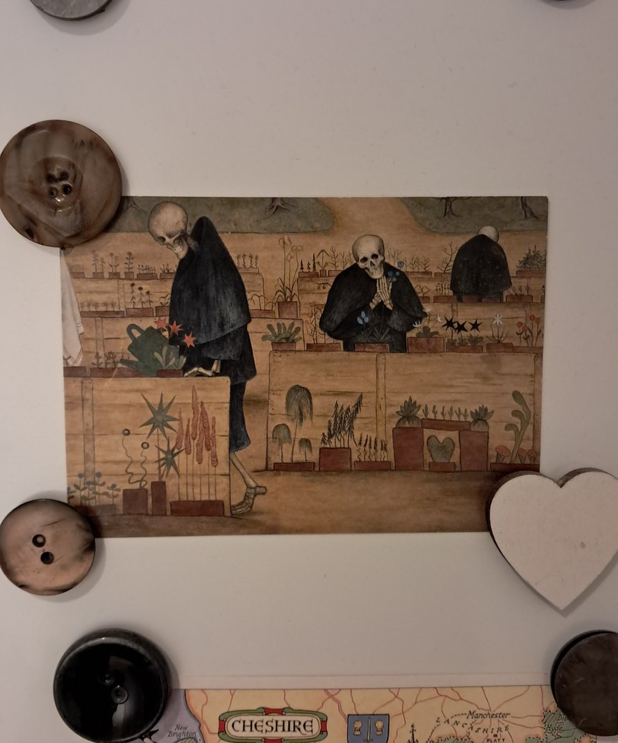 Ostin kortin lukion kevätretkellä Tampereelta 20 vuotta sitten. "Kuoleman puutarha" on edelleen lempiteokseni ja kortti esillä eteisessä.