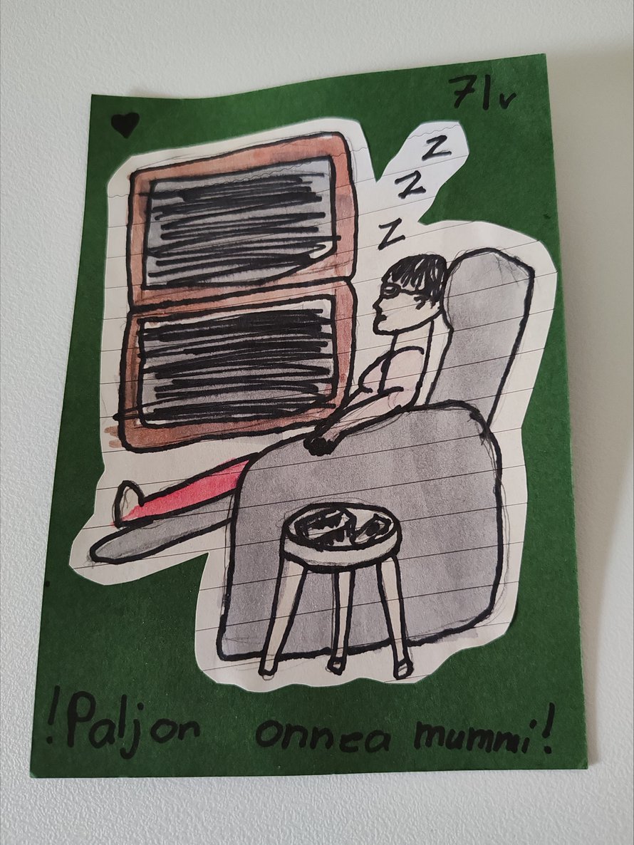 Mummi nukahtelee, vaikka olisi lapsia kylässäkin. Synttärikortti lapsosilta.
