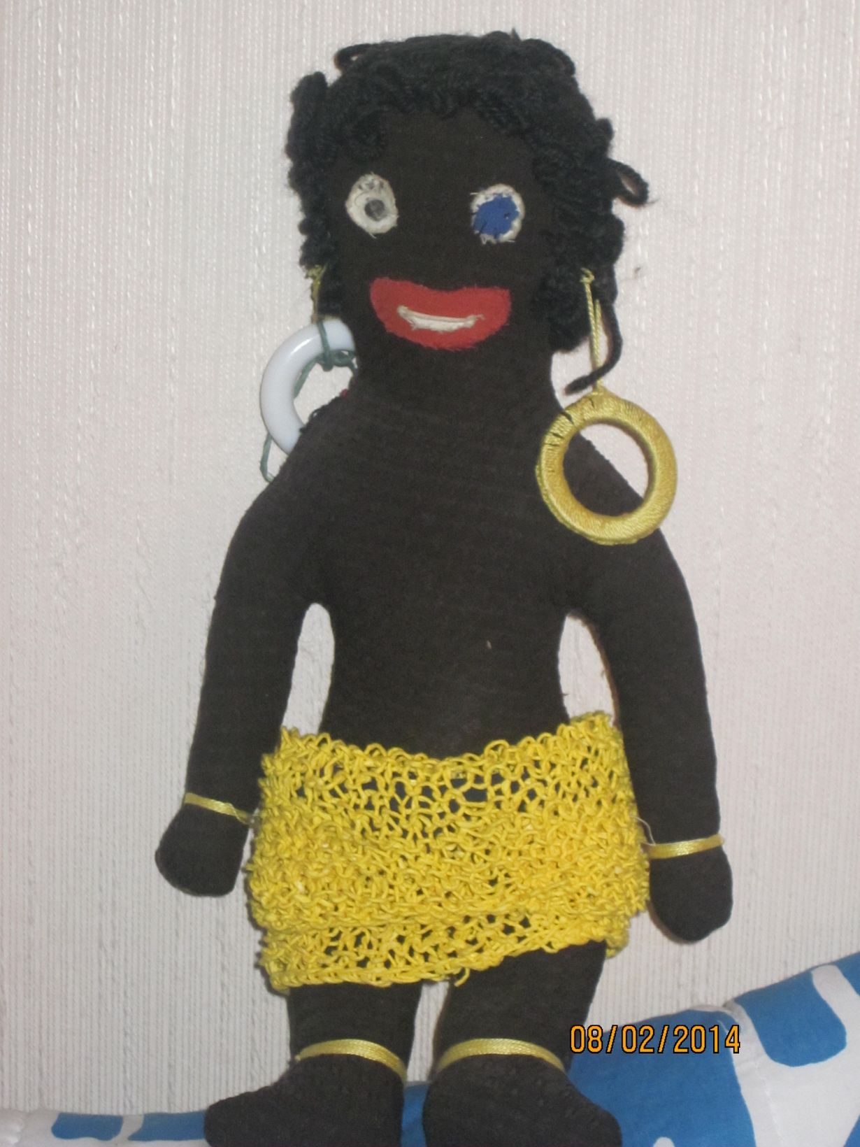 Ompelin tämän lapsena. Sille kuului niinestä hulahame. Se on hukkunut kuten toinen korvarengas ja silmäkin nypitty. Parannuksia on pitänyt tehdä ja hätäapua antaa.