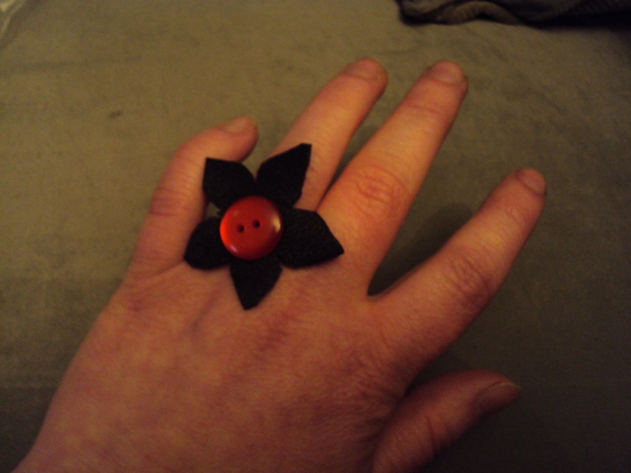 Suuri Käsityö - itse tehty koru nahkakukka-sormus 22.1.2013 klo 21:33 Otetaan rikkinäinen nahkatakki, punainen nappi, vanha sormuspohja ja pikaliimaa... ;) Hennuli