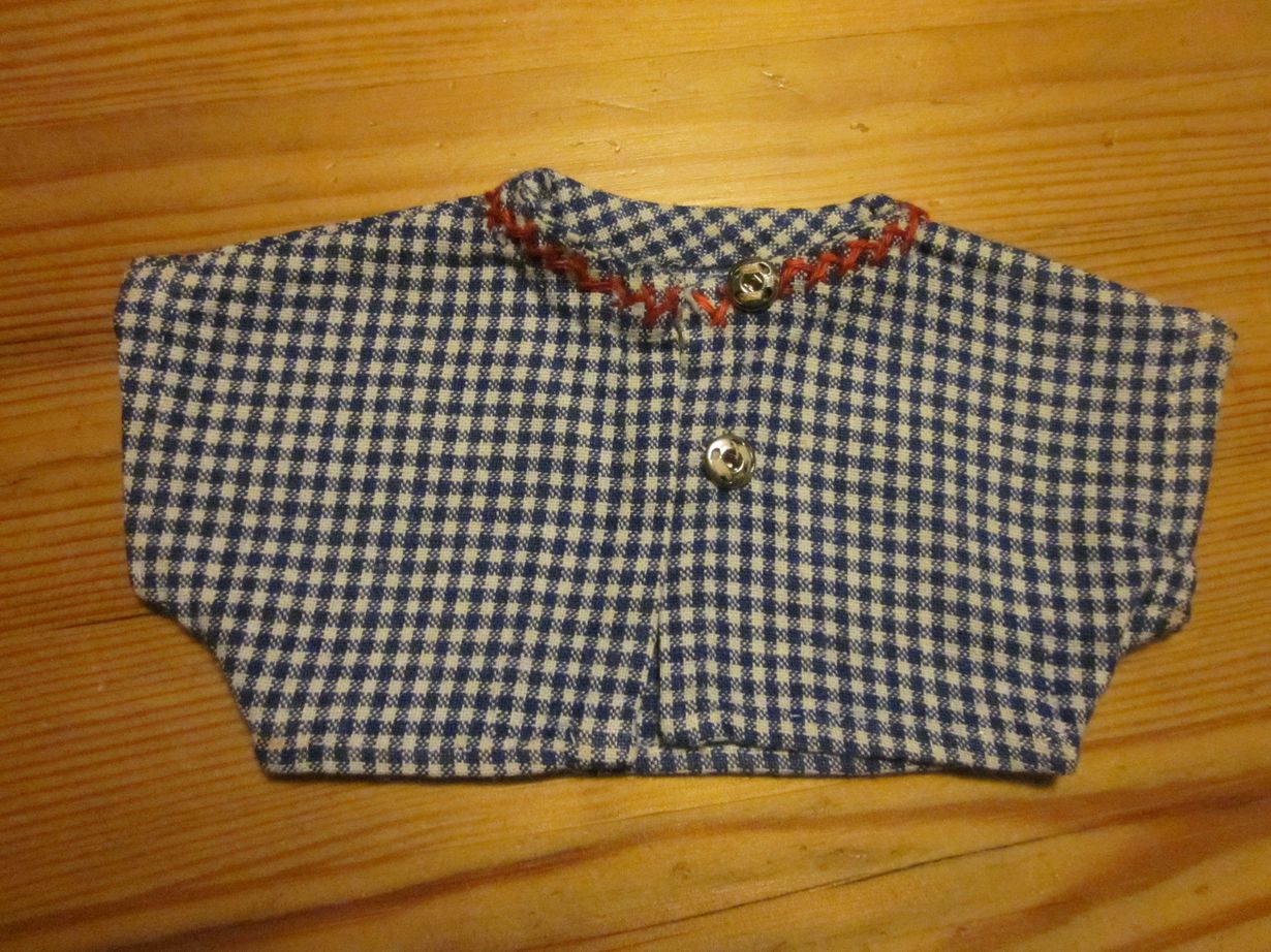 Äiti teki ensin minulle pienen nuken ja ompeli sitten sille asukokonaisuuden, johon kuului hame, pitkät housut, jakku ja takki. Kuuden vuosikymmenen aikana muut osat ovat hävinneet, tämä on rakas muisto.