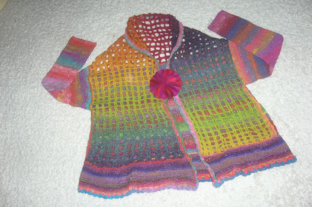 minulla oli käyttämättäjäänyt huovutettu kaulaliina,mietin miten voisin sen hyödyntää...siitä tuli jakku -virkkasin Noro-langasta hihat,etu-ja takakappaleet -työ valmistui nopeasti ja on tosi kaunis päällä- valmistin huovasta vielä kukkapinssin, millä pidän jakun kiinni