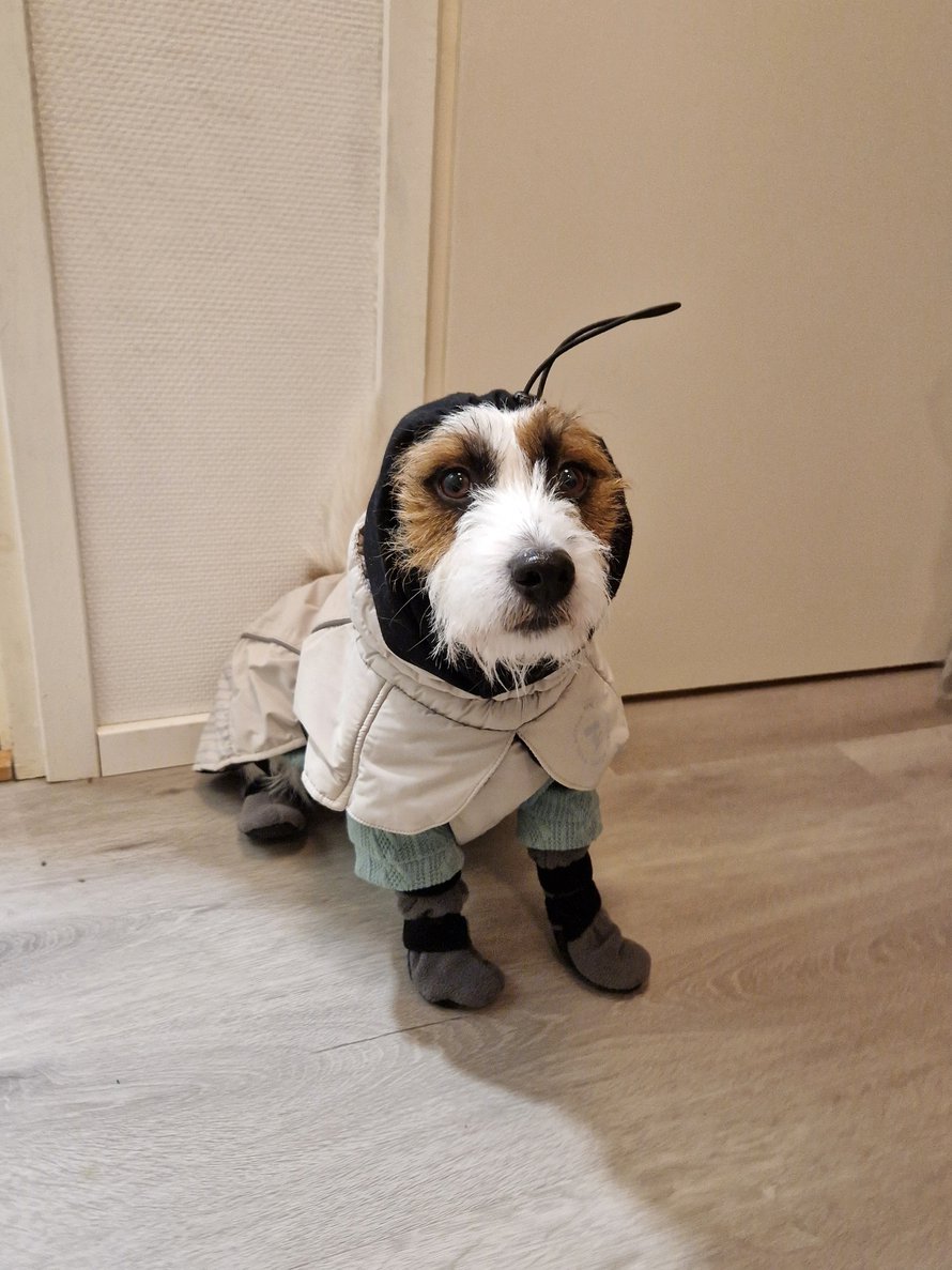 Jali on kotoisin Italiasta ja palelee täällä talven kylmyydessä herkästi. Mitä kovemmat pakkaset, sitä enemmän vaatekerroksia Jali saa ylleen. Ja tietysti myös tossut!