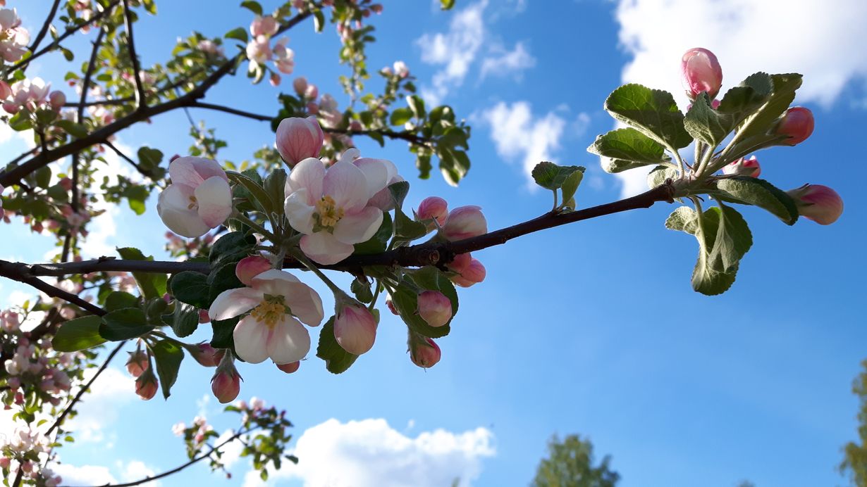 Nuoret omenapuut kukkivat todella runsaasti. Syksyn satoa odotellessa, voi haaveilla omenataivaasta: korit pullollaan omenoita, uuniomenaa, hilloa, omenapiirakkaa.