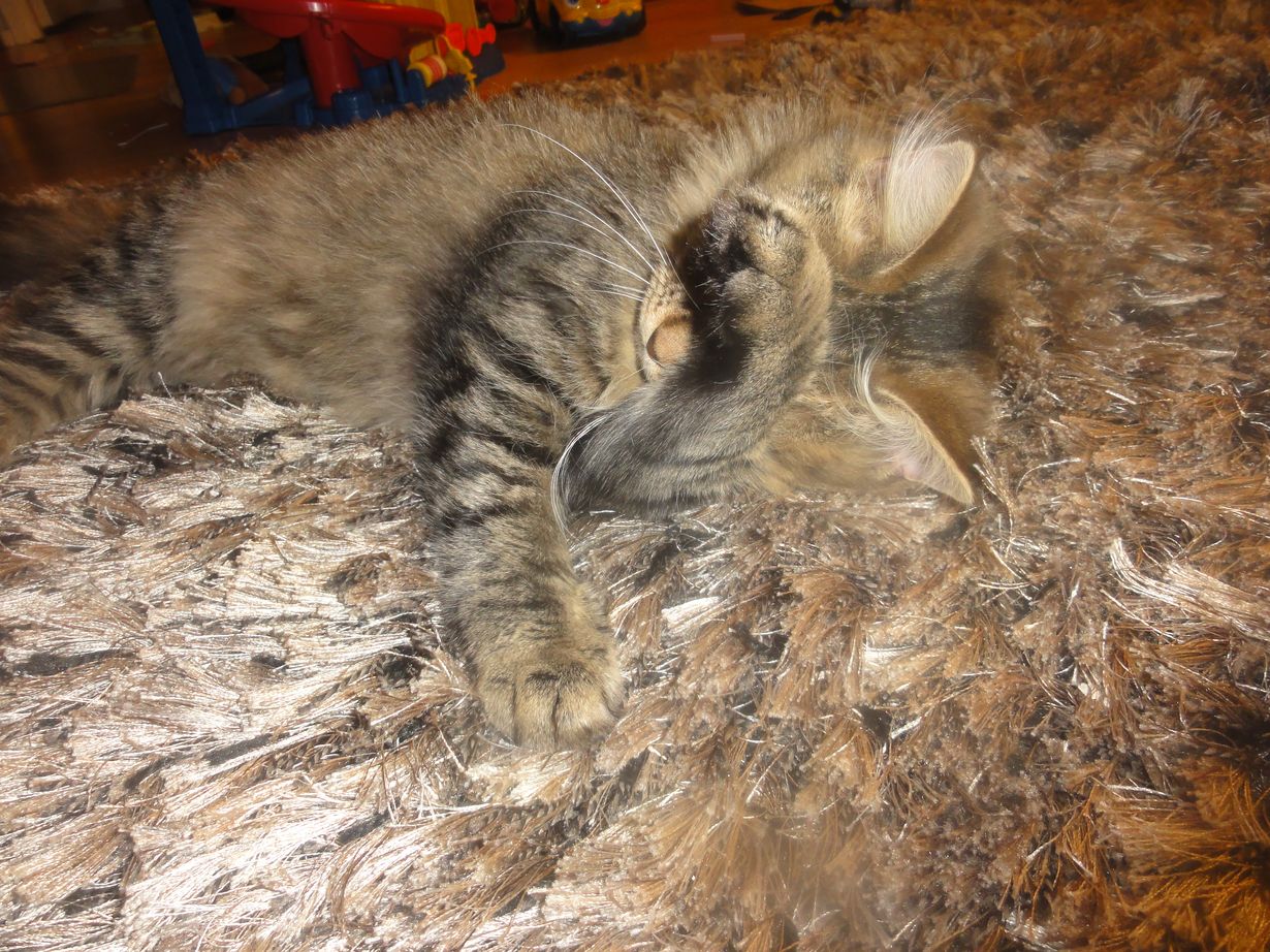 Kuvassa on meidän Onni kissa, kuvassa ikää 6kk(Nyt ihan pian 9kk). Onnin lempinukkumapaikka on tämä kuvassa näkyvä karvainen matto. Nukkuu myös sohvalla, sängyssä ja poikamme 6v vieressä. Onni nukkuu päivän aikana monia tirsoja, yöt nukkuu sitten kokonaan.