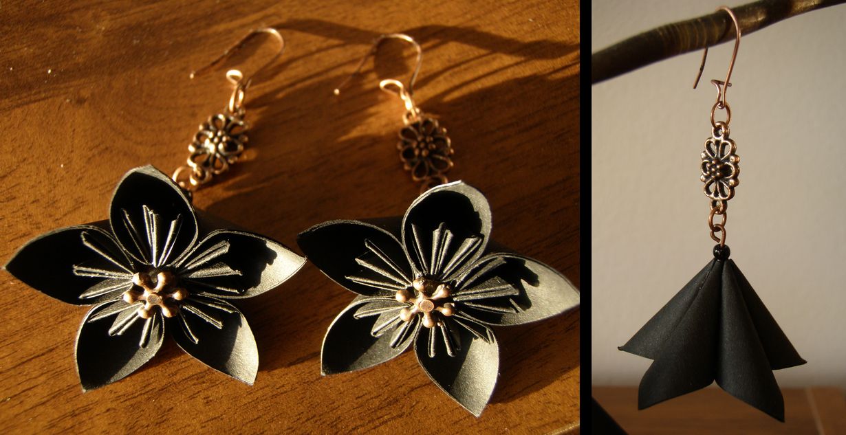 Korvakorujen kukat on valmistettu mustasta paperista taittelemalla. Paperiset korvikset ovat kevyet käyttää. Koruissa käytetyn materiaalin ei välttämättä aina tarvitse olla kallista jalometallia tai -materiaaleja löytyy joka puolelta!