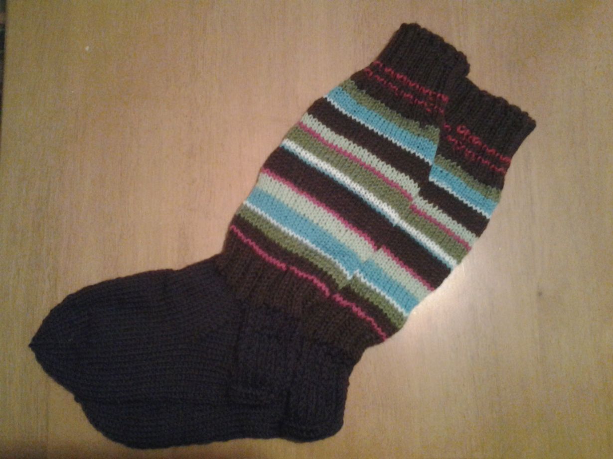 Olimme joulukuun alussa koko perheen voimin reissussa, juuri ennen mieheni suurta selkäleikkausta. Minulla oli mukana jämälankoja tyttäreni tilaamia amigurumeita varten. Kun sain ne valmiiksi, mieheni toivoi uusia villasukkia. Ryhdyin toimeen, ensimmäisen sukan varsi valmistui reissun aikana, terä sairaalassa leikkauspäivänä odotellessa ja toinen sukka kotona yksin ollessa kun mieheni vielä makasi sairaalassa. Nyt jo kotiutuneena sukat ovat olleet kovassa käytössä, ne on helppo pukea kun varret ovat riittävän löysät.