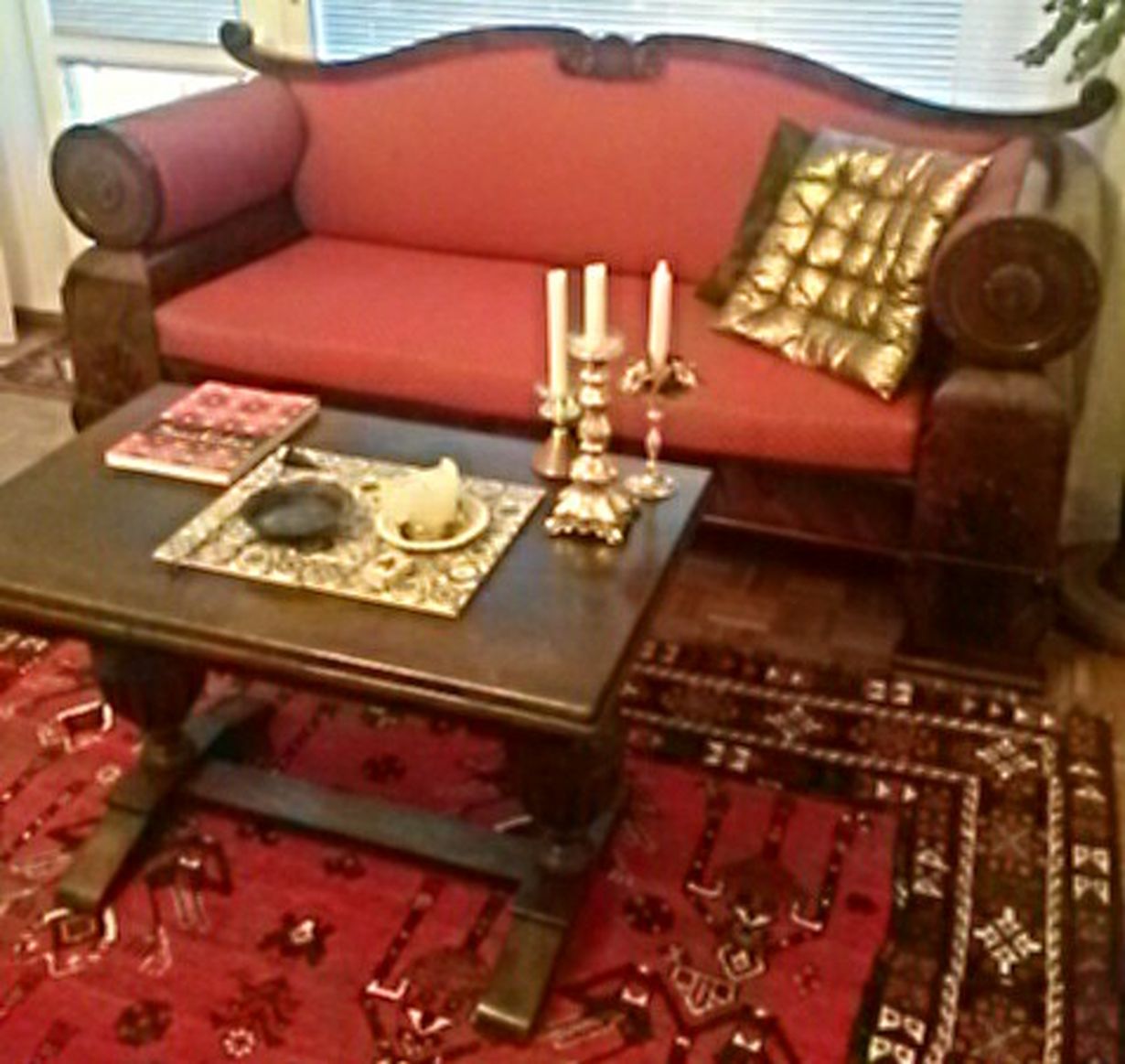 Paras kierrätyshuonekaluni on 1980-luvun lopulla huutokaupasta hankkimani biedermeier-sohva. Sohva palveli eri kodeissani, kunnes päätyi osina moneksi vuodeksi varastoon. Viimeisimmän muuton yhteydessä se oli joutua kierrätyskeskukseen, mutta onneksi sai kuitenkin uuden elämän kunnostettuna. Alkuperäinen kangas oli ruskea; tämä verhoilijan suosittelema punainen sopii hienosti sohvan tyyliin. Minulla on useita vanhoja ja kierrätettyjä huonekaluja: perittyjä, kirpputoreilta ja huutokaupoista hankittuja, mutta tämä sohva on joukon kuningatar.