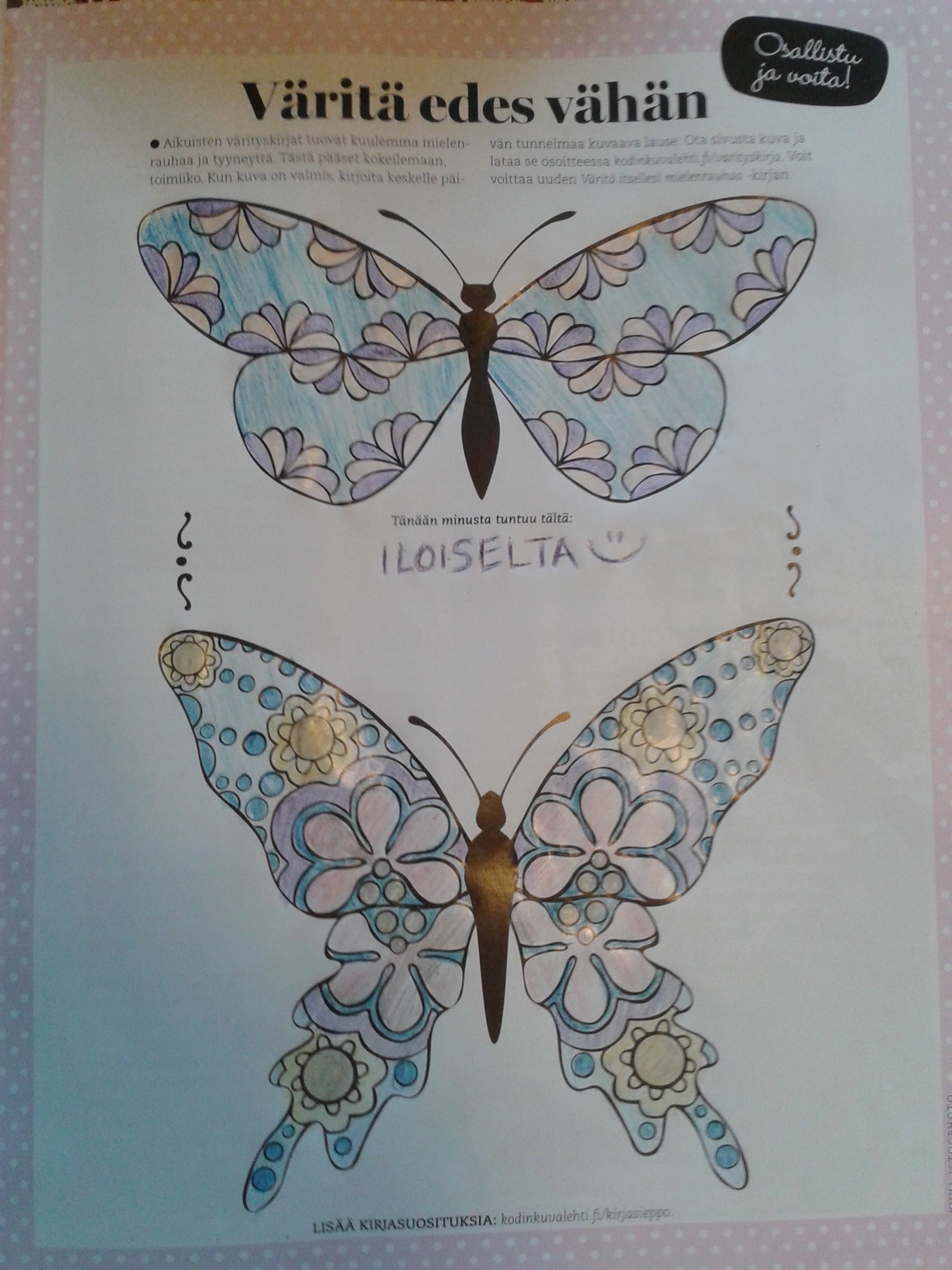 Mielenrauhaa aikuisten värityskirjasta - väritä perhoset ja voita!