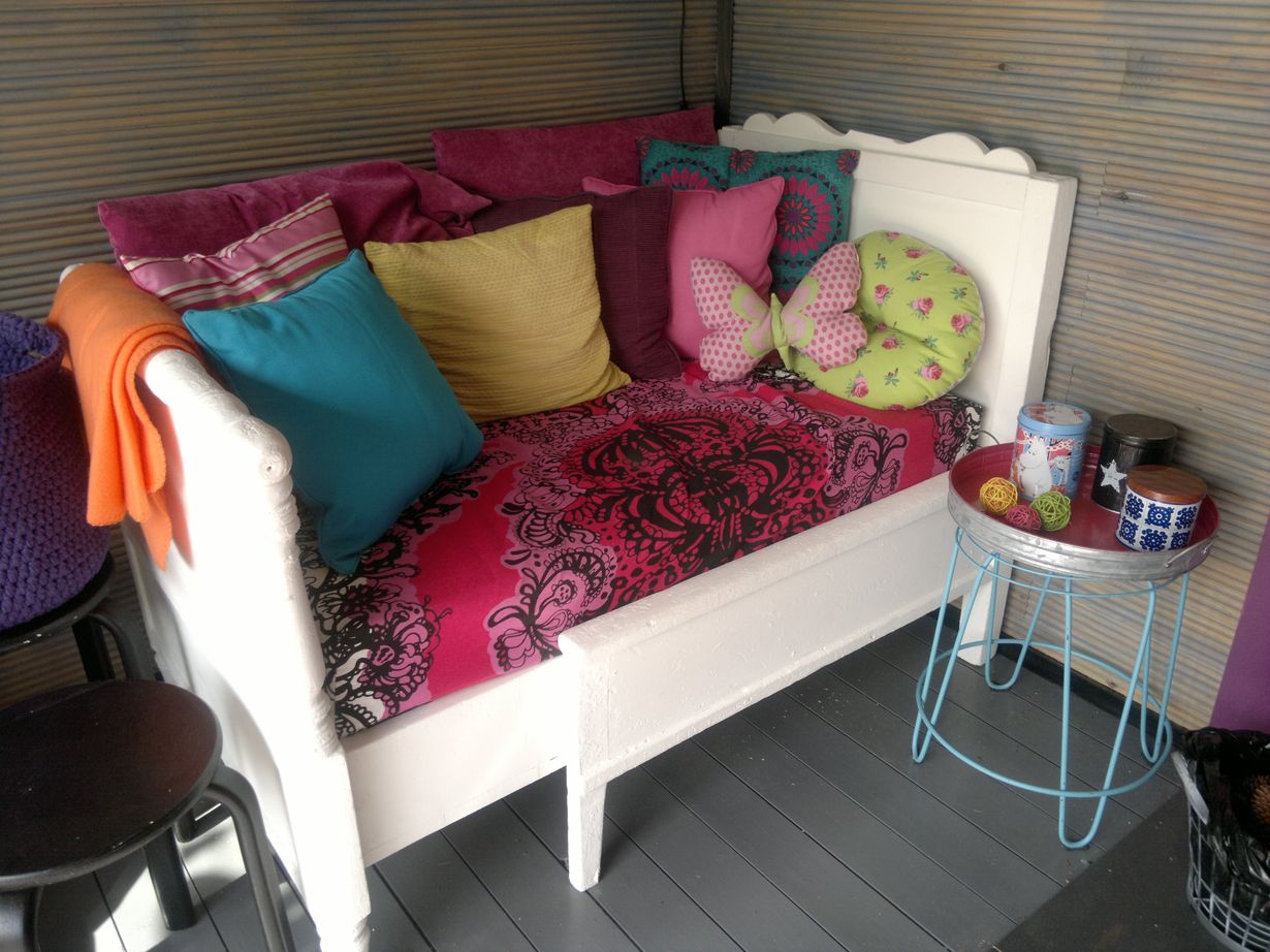 Tämä kesäpeti on äidinisäni tekemä lapsilleen. Nyt olen tehnyt siitä äitini avustuksella pehmeän lukunurkkauksen omaan pihapöksään sadesään ja varjon tarpeen tullessa vastaan.