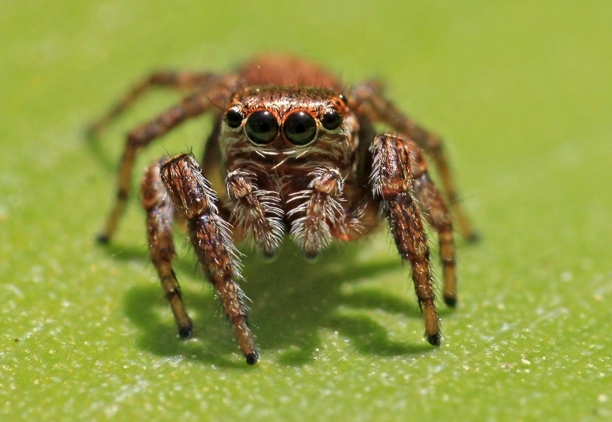 Muutaman millin mittainen kangassirppihypykki tuijotti kielon lehdeltä. Kangassirppihypykki on Suomen yleisin hyppyhämähäkki, mutta ne ovat niin pieniä, että niitä harvoin huomaa.