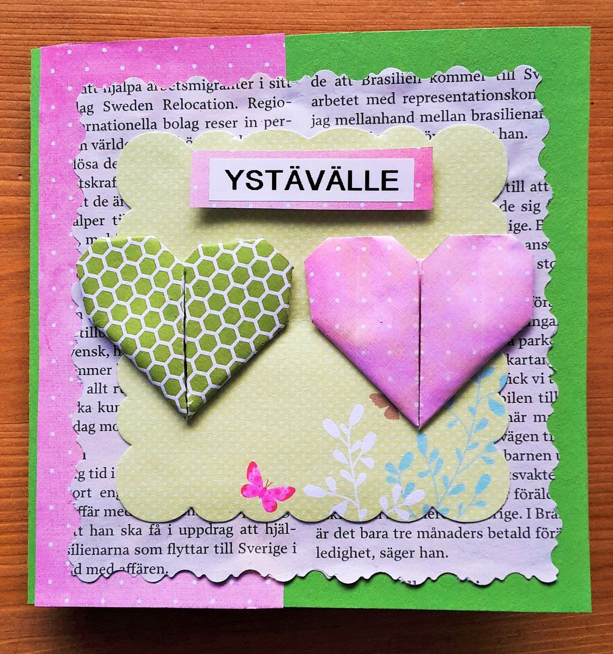 Vaaleanpunainen ja vihreä origami-sydän taiteltu kuviopapereista ja taustalla pala kirjepaperia sekä tavallista sanomalehtipaperia.