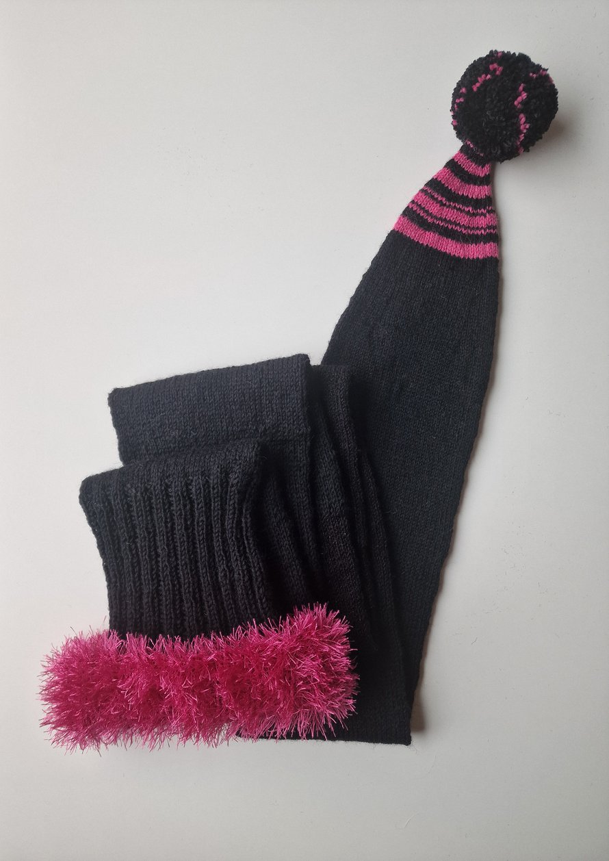 Äiti pyysi joululahjaksi "pitkän, pitkän bling, bling aniliininpun./musta neuletonttulakin" käytin jämälangoista mm. kimaltavaa mustaa lankaa, joka ei kyllä kuvassa näy.
