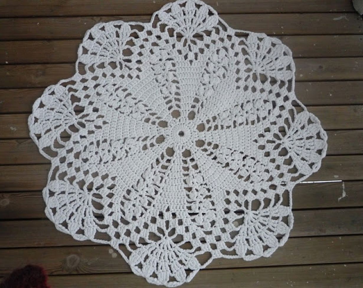 Tytär toivoi mattoonsa pitsiä ja kun en valmista mattomallia löytänyt, virkkasin maton pienen pitsiliinan ohjeella 8 mm koukulla ontelokuteesta. Matto on läpimitaltaan noin metrin ja kudetta kului 1.5 kg.