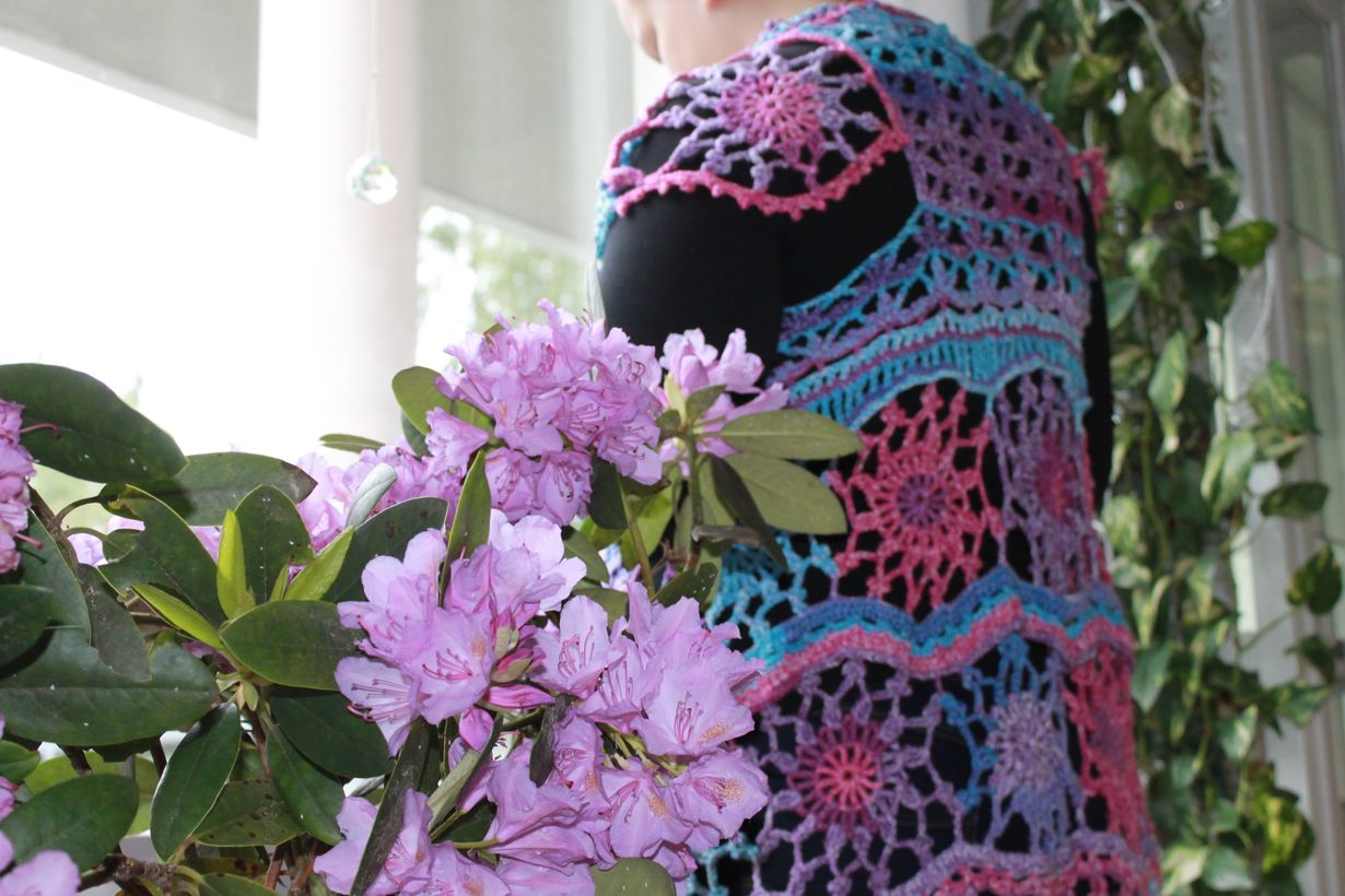 Kirjavasta kevään purolangasta syntyi röijy. Väri kiehtoi niin, että siitä oli jotain tehtävä. Malli on sovellettu netinstä löytyneestä kuvasta. Loppulangasta syntyi violetit isot tähtikorvikset jotka kovetin liima-vesi seoksella.