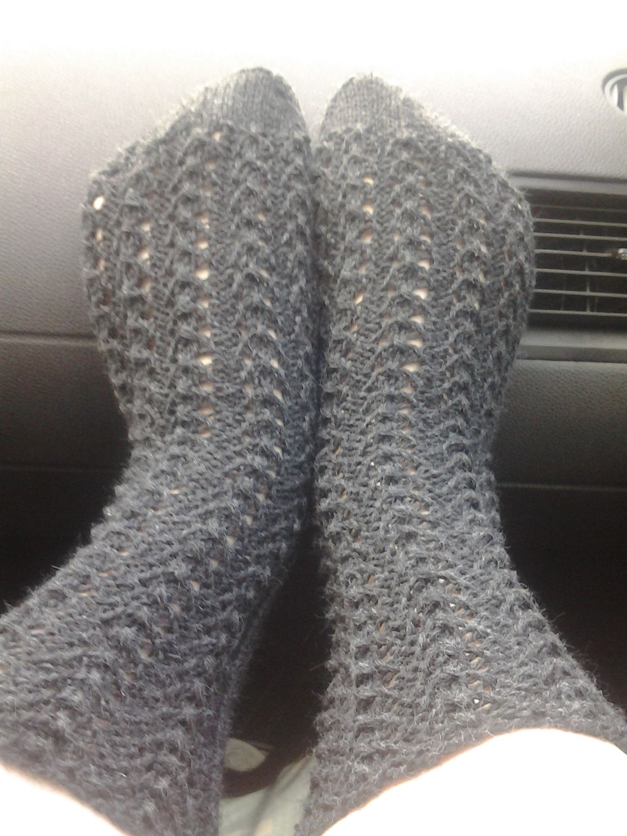 Sukat siskolle valmistuivat kesällä automatkalla kotiin kummipojan rippijuhlista. Sukkia en saanut annettua heti, mutta olipahan edes kuva.