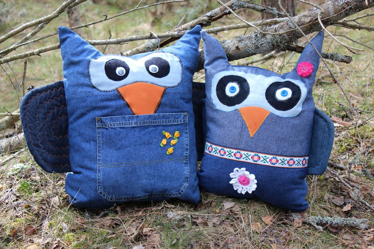 Suuri Käsityö - itse tehty sohvatyyny Pöllöt sohvatyynyt! 20.4.2015 klo 10:22 Vanhoista farkuista ja muusta kierrätysmateriaalista tehdyt tyynyt sohvalle. Mahataskussa voi säilyttää kaukosäätöjä yms. Kierrättäjä