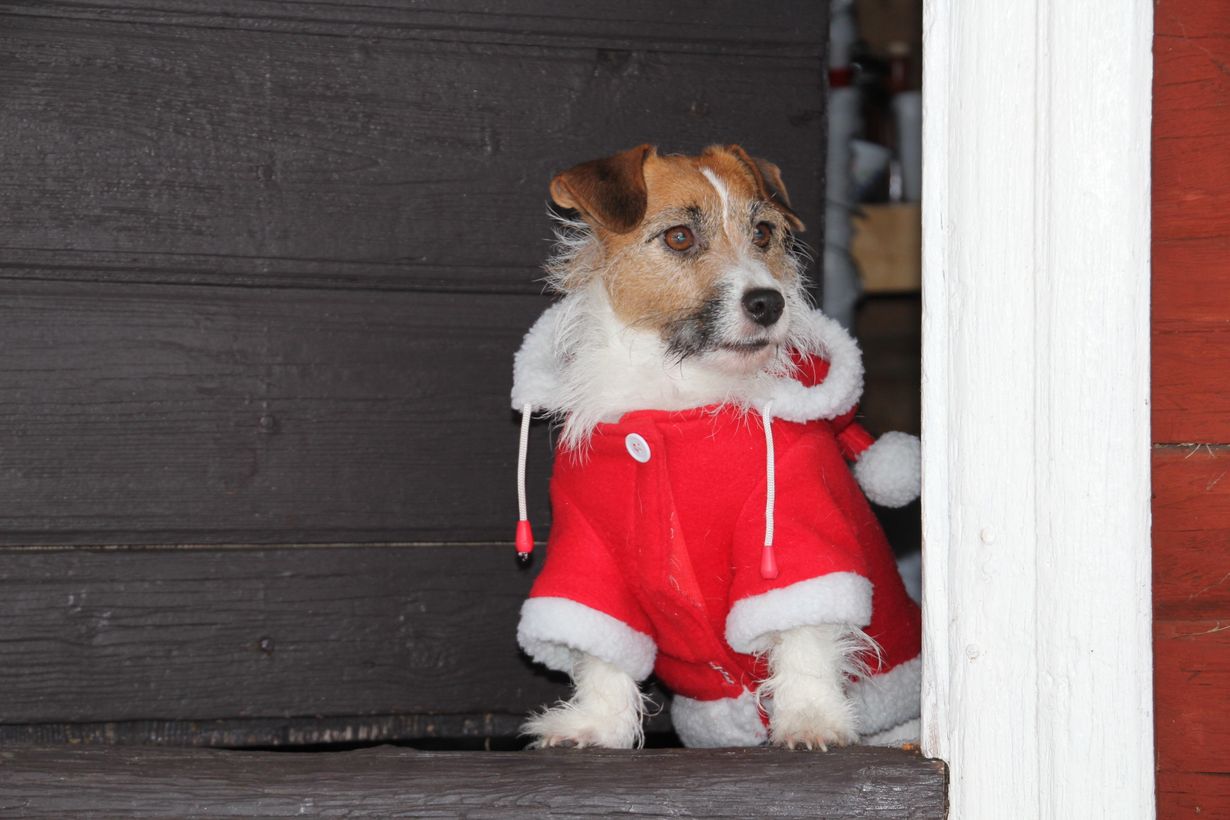 puetaan päälle. Puku tuli lahjana muutama vuosi sitten Saksasta. Kuvassa Pomppu kurkistaa vanhan hirsiaitan ovesta täällä Puumalassa.