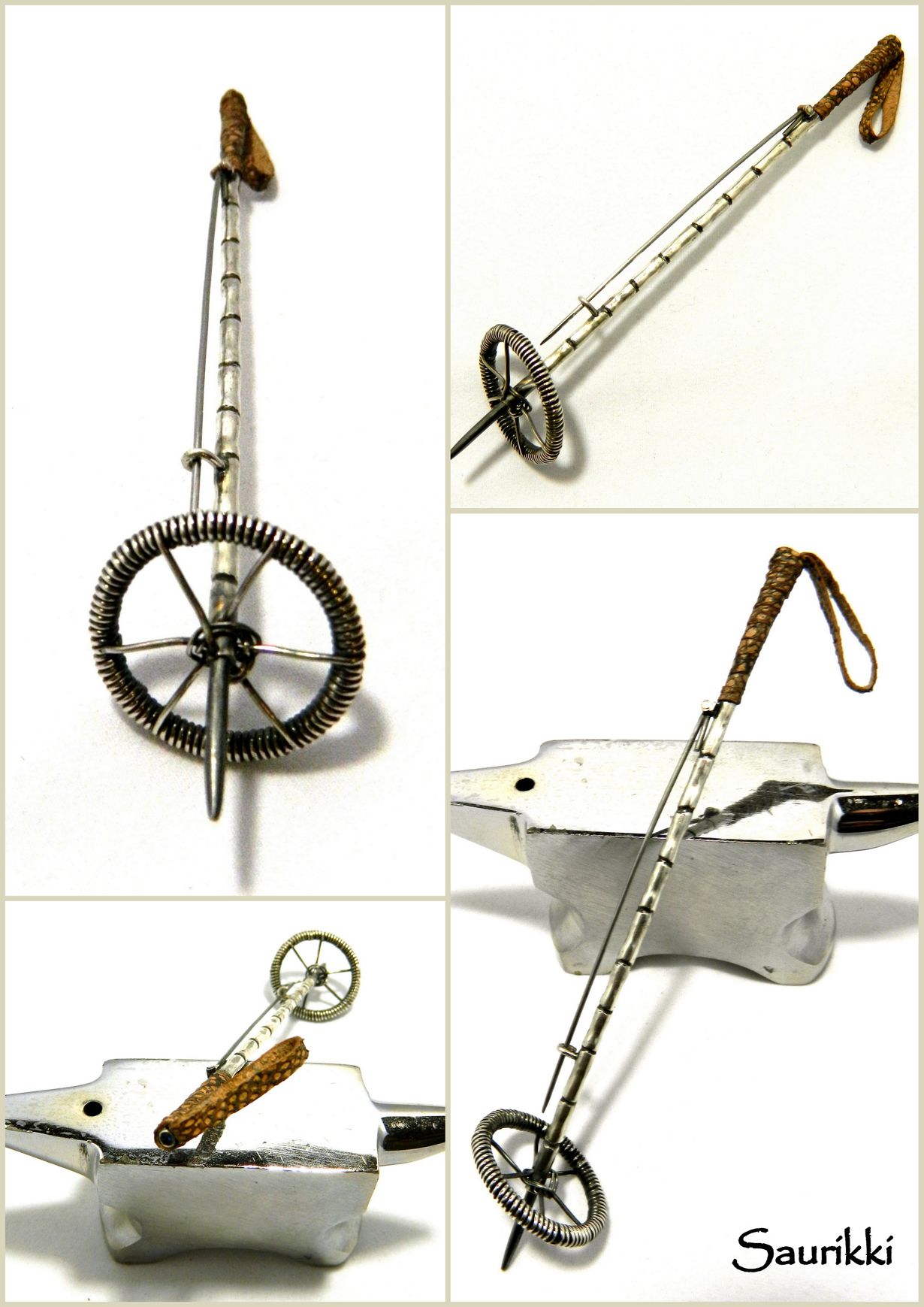 Rintaneula kantajalle, joka ei ihan niin tosikko ole :). Porkka on valmistettu hopeasta, kädensija on mateennahkaa, päähän on istutettu pienoinen akvamariini.