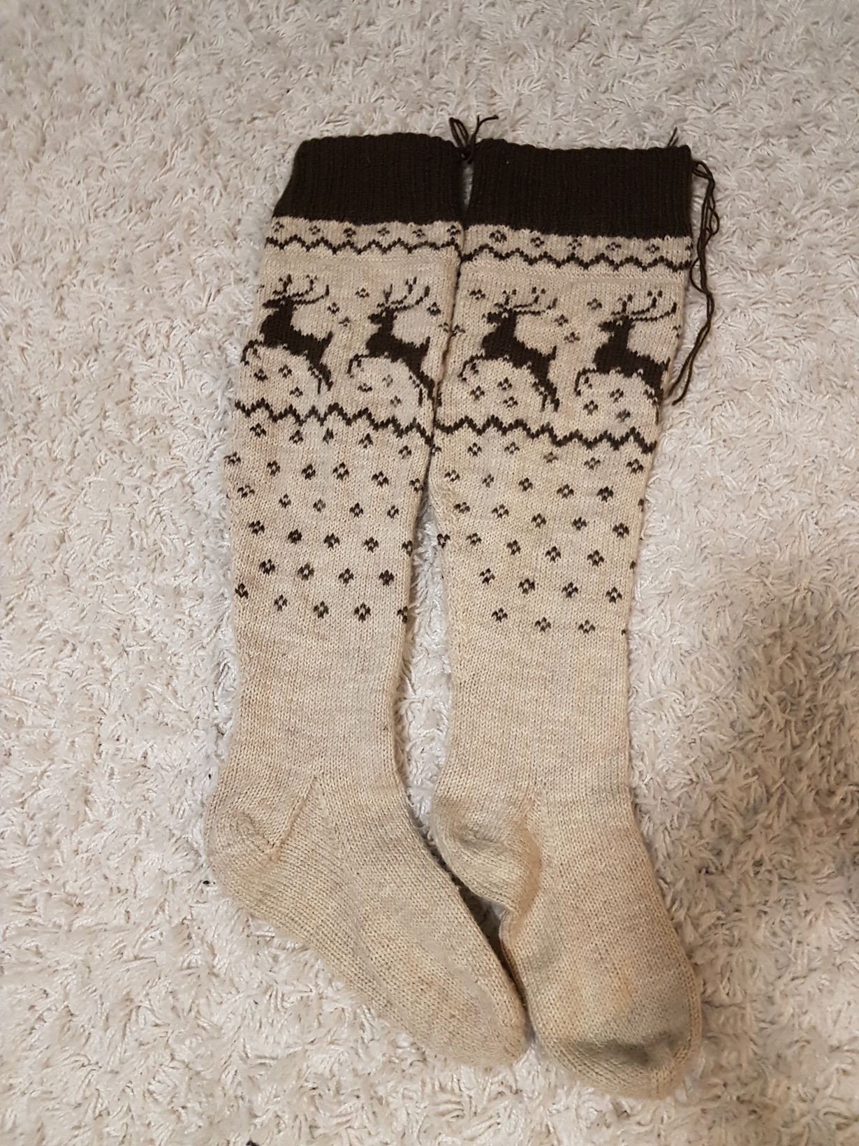 Ensimmäiset neulomani polvimittaiset sukat. Neulottu varmaan 10 vuotta sitten. Jouduin vielä toisena neulomani sukan purkamaan lähes kokonaan kun siitä tuli paljon suurempi kun ensimmäisestä, muttei niistä silti tullut täysin saman kokoisia. Välttävät siitä huolimattama mökkisukkina mainiosti.