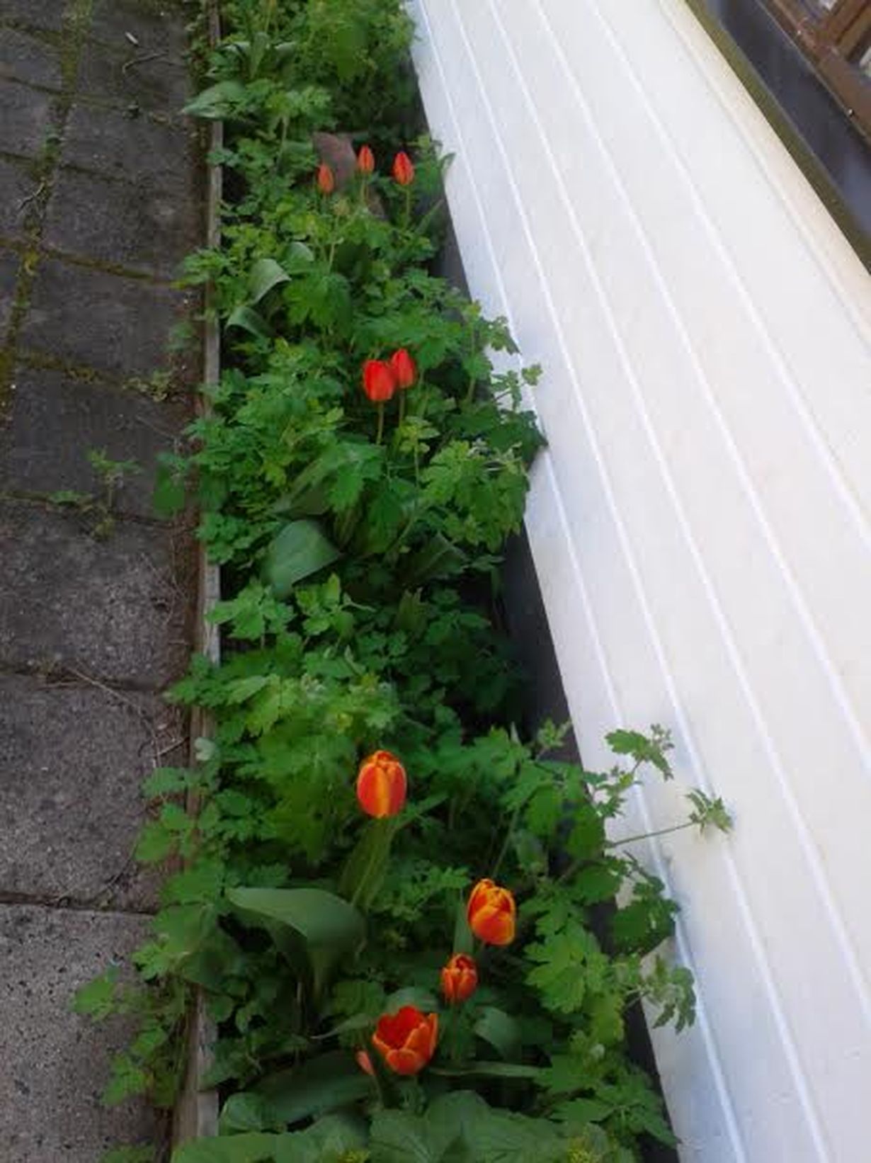 Sisäpihaamme kiertävät kukkamaat, jotka on rajattu maantuneen puun värisillä laudoilla. Lapsenlapset saavat kilvan juoksennella, eivätkä koiratkaan hyppää "laatikoihin".