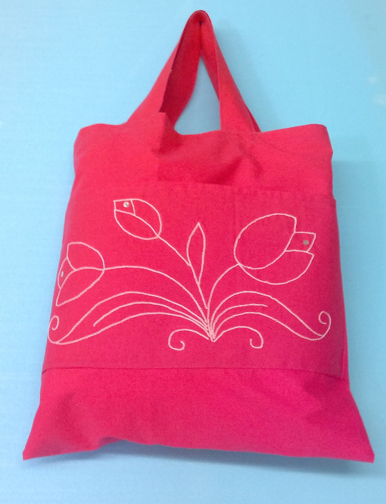 Tehty kierrätyskankaasta. Kassissa myös vuori (keltainen). Päällä koko kassin levyinen tasku, jonka kirjoin muliinilangalla. Kuvan piirsi minulle työkaveri, en siis ole hyvä piirtämään, mutta kaavoja en kasseihini muuten tarvitse, enkä käytä. (lähetin myös kuvan omasta kesäkassistani, vihreä-valkoinen aplla-aplikointeineen, jonka myös ompelin kaavoitta kierrätyskankaista).