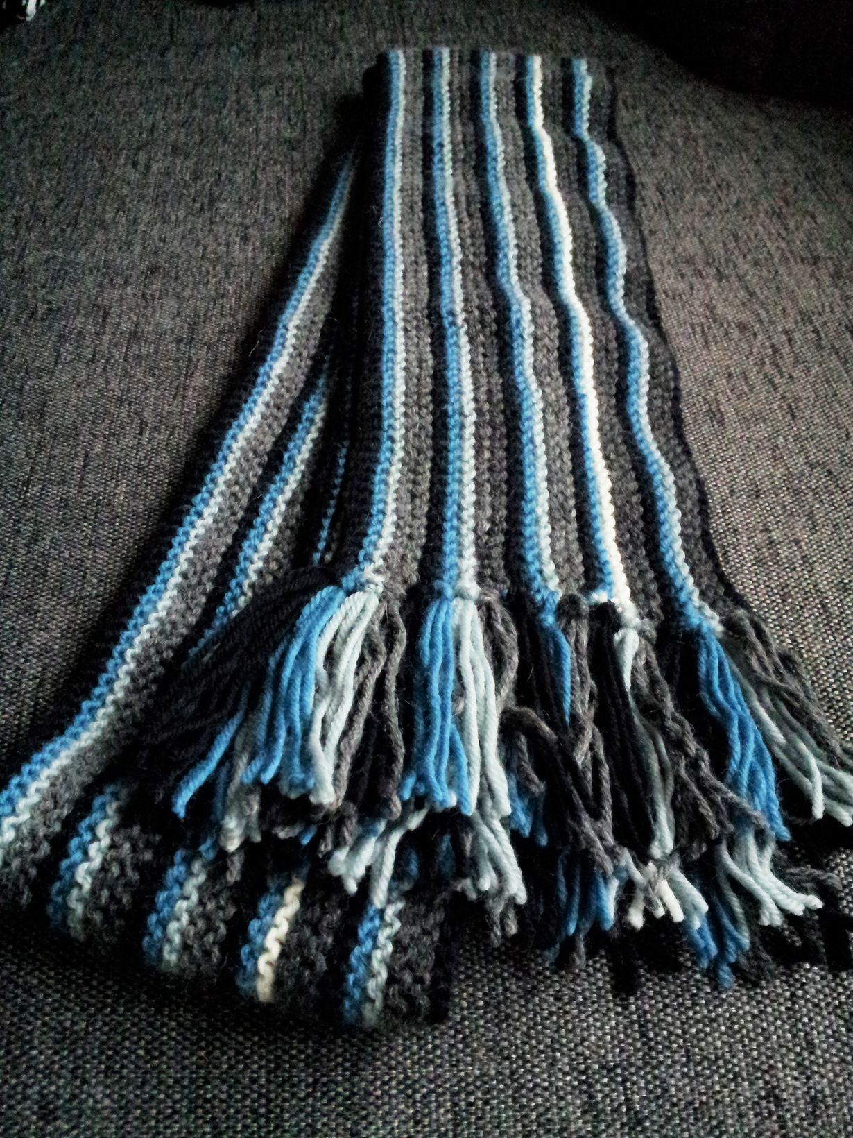 Idea huiviin syntyi, kun huomasin pituussuuntaisten raitojen olevan muotia miesten kaulahuiveissa. Neuloin pyöröpuikolla ainaoikein neuleena raidallisen miesten kaulahuivin joulupukin konttiin itse keksimällä ohjeella.