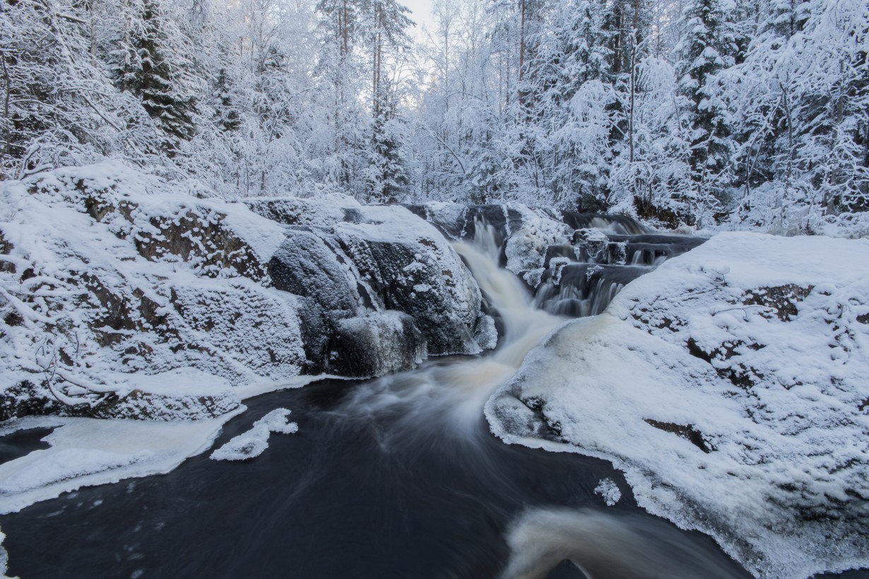 Raikas pakkaspäivä veden virrassa. Kuvattu Puolangalla.