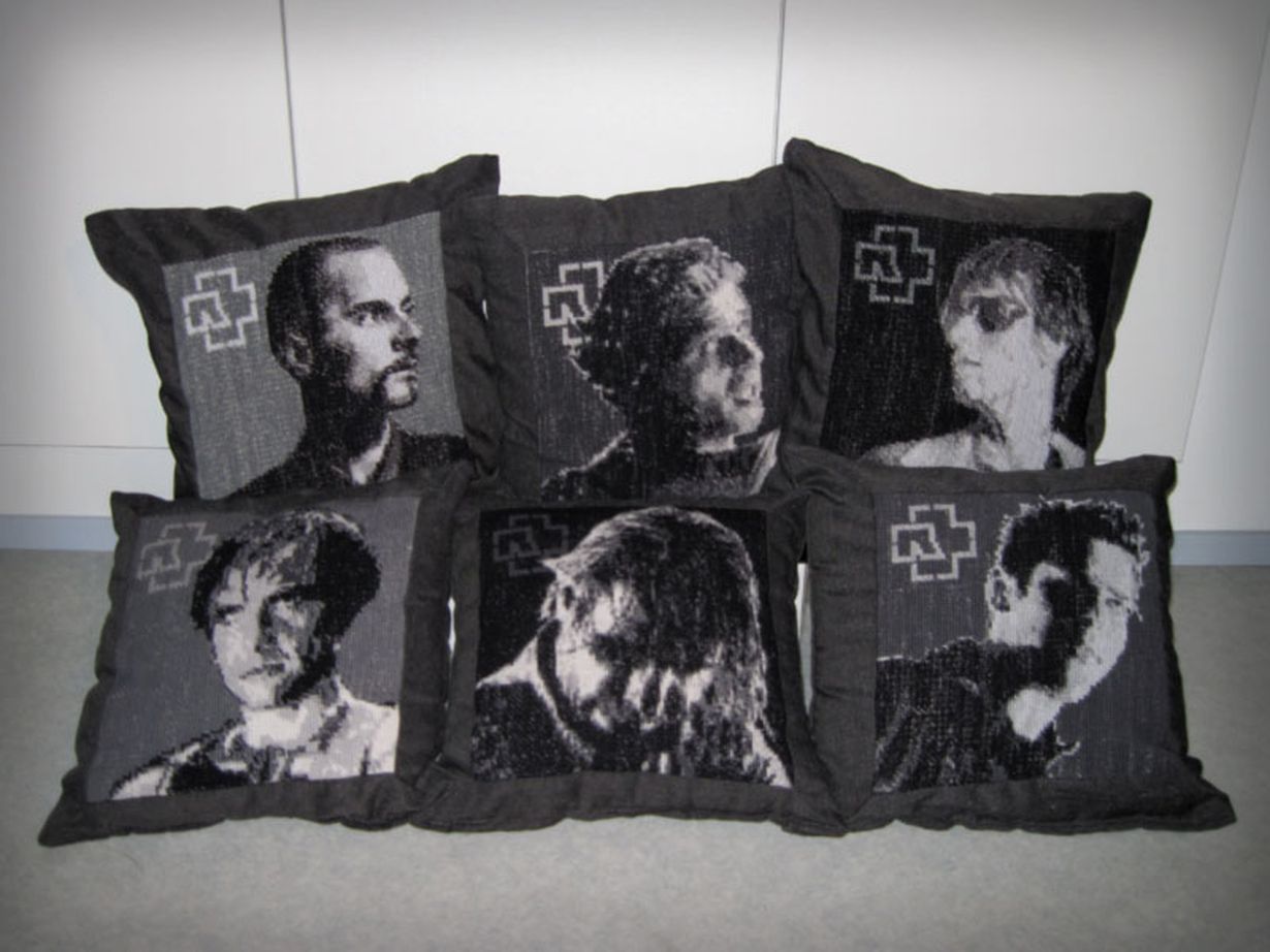 Nämä rouheat sohvatyynyt tuli tehtyä Rammstein-bändiä fanittaessani. Ne saavat edelleen osan vieraistani hämmennyksiin ja kyselemään, mistä ne on ostettu. Kaikki ovat kuitenkin itsetekemiäni kanavatöitä.