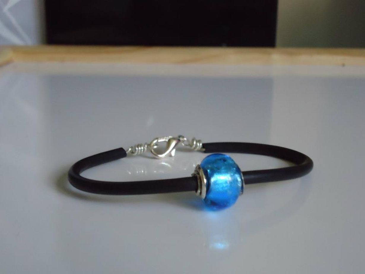 Musta putki on sähköjohdon eriste, putken sisällä hopeioitua kuparilankaa, lisäksi korussa on papukaijalukko ja lasihelmi metalliosilla. Helmi on lukittu paikalleen metallilangan pätkällä.