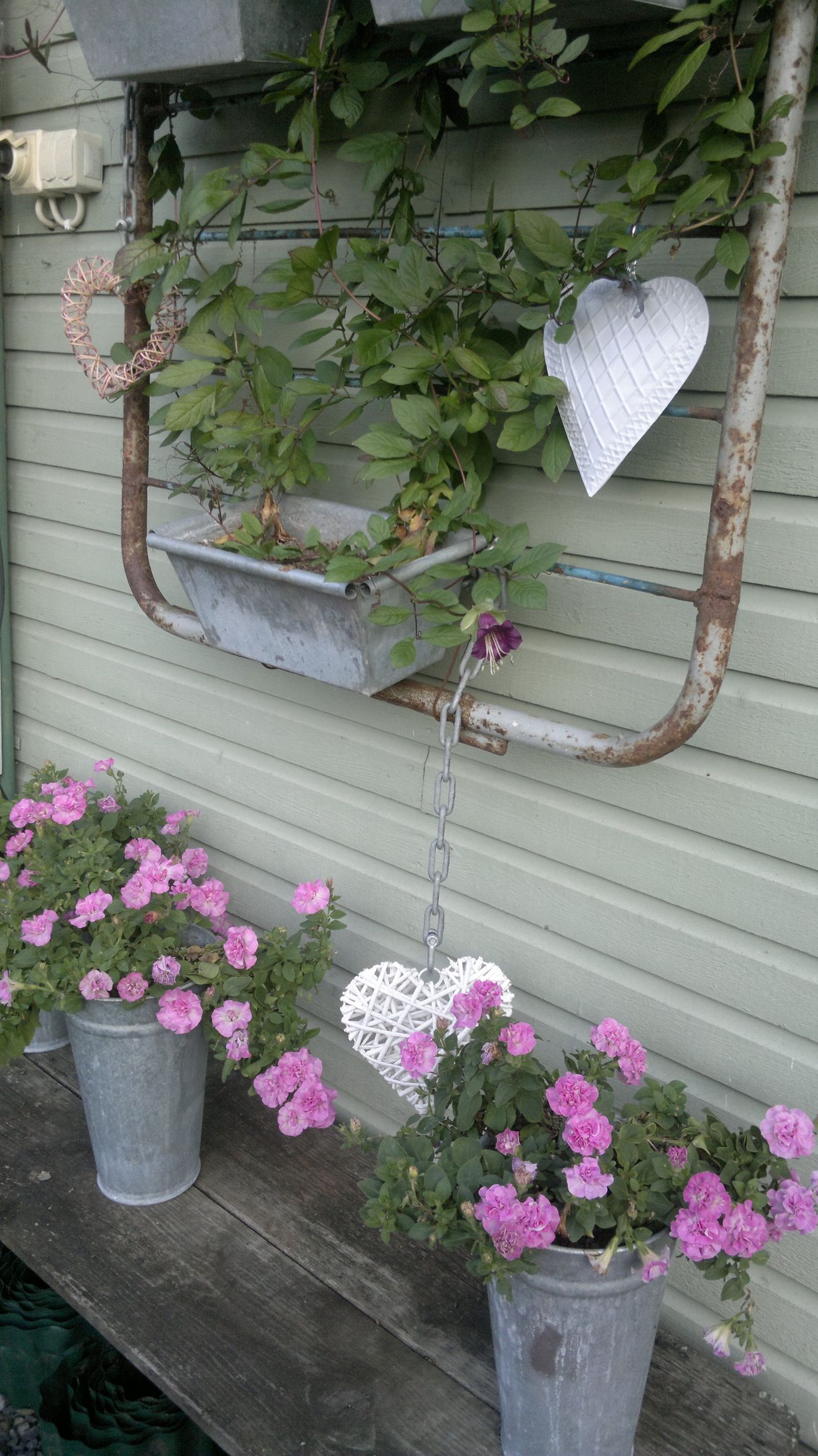 Rintamamiestalon vanha portti pääsi seinälle köynnöstueksi ja toimi hyvin siinä työssään. Shabby chic tunnelmaa vahvistaa vanha pihalta löytynyt penkki ja kerrospetuniat sinkkiastioissa - uusi suosikkikukka on löytynyt!