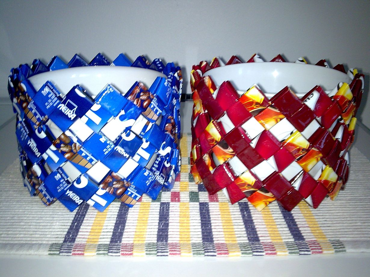 Tämä on hauskaa näpertelyä ja värien kanssa suunnittelua. Sain vinkin hakaketjutekniikasta Seija Saarisen kirjasta Kahvipussin uusi ulottuvuus. Kehittelin ruukunsuojia, ne ovat käteviä tehdä taittelemalla ja yhteen liittämällä neulaa ja lankaa apuna käyttäen. Eri kahvimerkeistä tulee erivärisiä. Mallissani on yhteen ruukunsuojaan käytetty 19 kahvipussia, toinen on Juhla Mokasta ja toinen on Saludosta. Olen saanut melkoisen määrän käytettyä kahvipusseja, kun ruukunsuojia on valmiina jo 15 kpl.