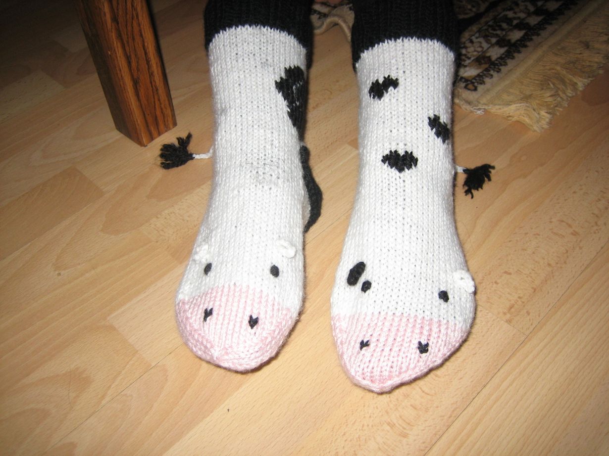 Suuressa Käsityössä näkemieni hiirisukkien innoittamana neuloin lehmäsukat joululahjaksi minut käsitöitä tekemään innostaneelle kummitädille. Toisen sukista kirjoin silmukoita jäljitellen kukilla ja toisen sydämillä. Nimekseen lehmät saivat Ruusa ja Hertta.