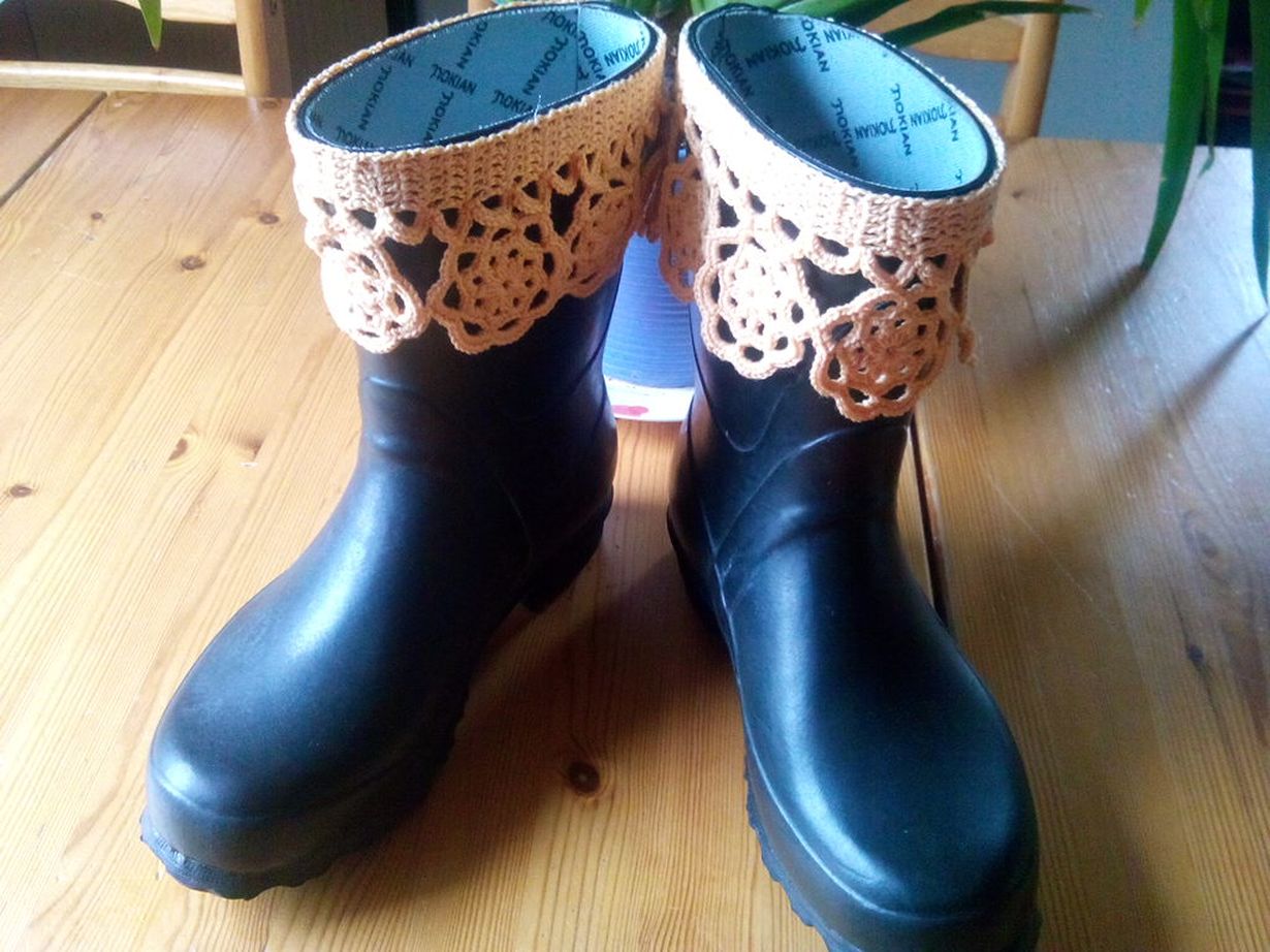 Innostuin suuri käsityö lehdessä 5-6/2014 olleesta saapas pitsi ohjeesta ja tein itselleni sellaiset.työhön voi hyvin käyttää jämiä tekemällä kukista eri värisiä.