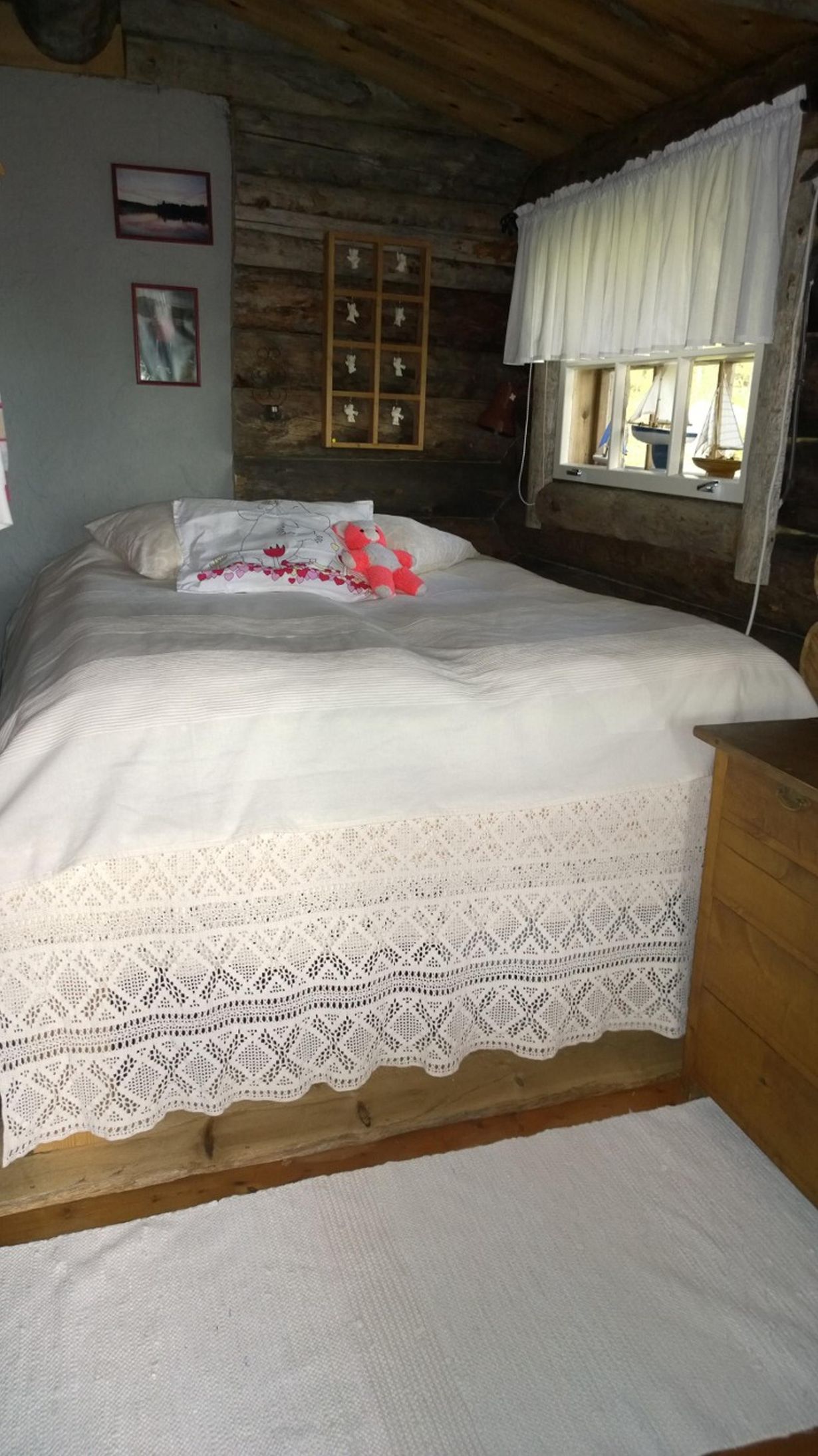 Vanhaan saunaan tehty minulle ja miehelleni oma pikku kammari mökille Heposelänrannalle Liperiin. Siellä hiljaisuudessa nukkuu kuin lapsi. Sänky on pedattu isoisomummon virkatulla sänkypeitolla 3