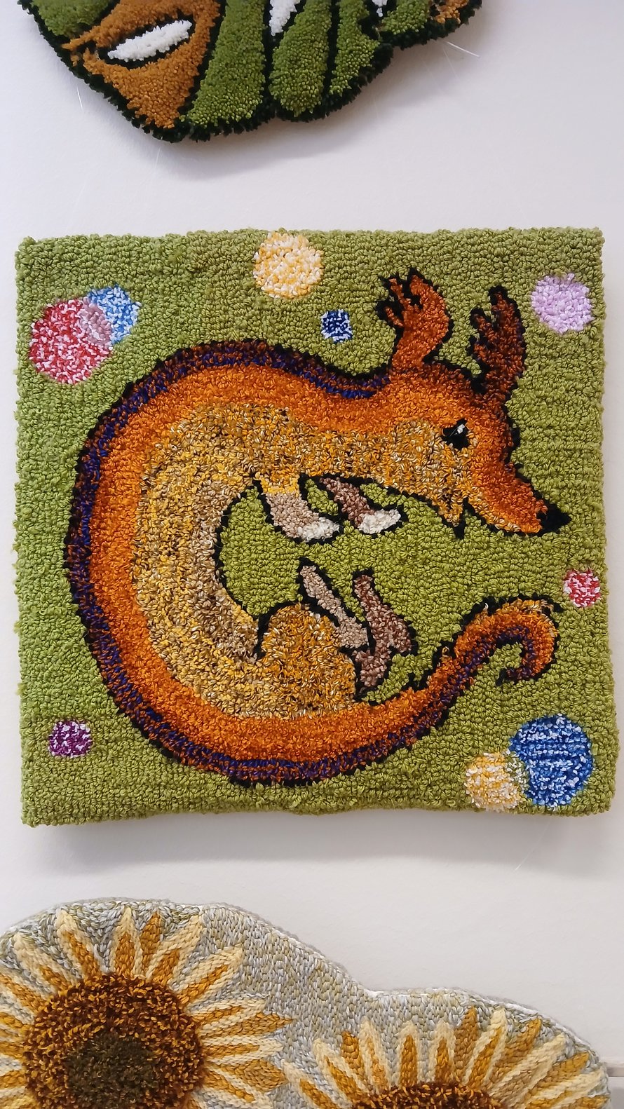 Tuftasin seinävaatteen poikani tyttöystävälle valmistujaislahjaksi. Kuvassa heidän koiranpoikanen, Dexter.