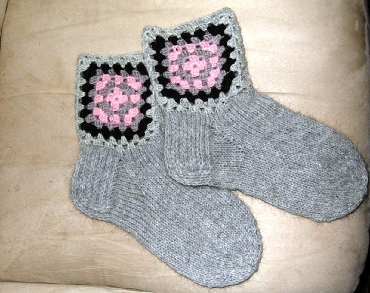 Torkkupeitosta tuli sukat. Kaksi palaa riittää varteen. Terä neulottu langasta, jossa puolet lampaanvillaa ja puolet koirankarvaa. Ovat todella lämpimät.