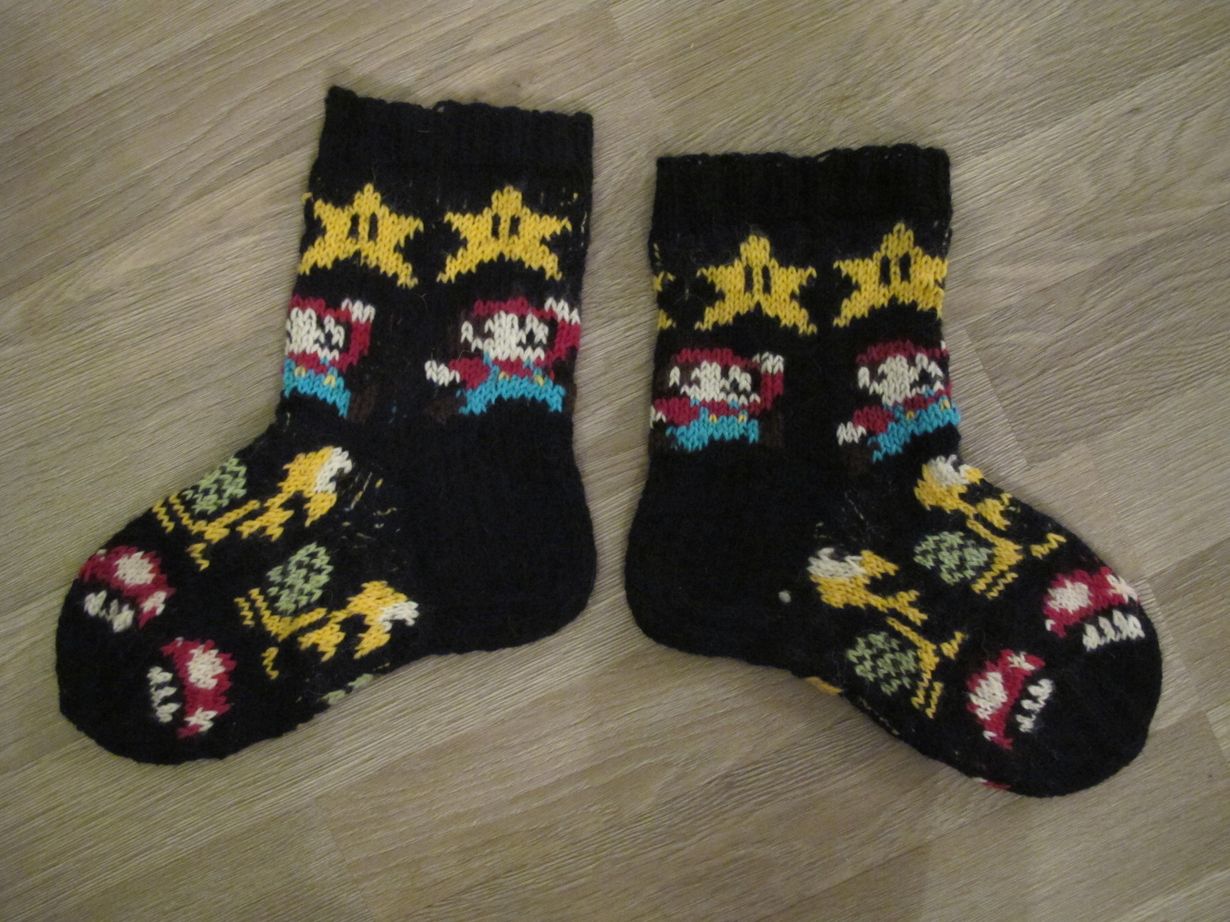 Kirjoneule- ja silmukoiden jäljittelyllä toteutetut Super Mario- villasukat livahtivat joulupakettiin. Itse suunniteltu kuvio oli innostava!