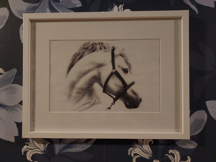 Sain työkaverilta syntymäpäivälahjaksi piirroksen, jonka kuva muistuttaa edesmennyttä hevostamme.