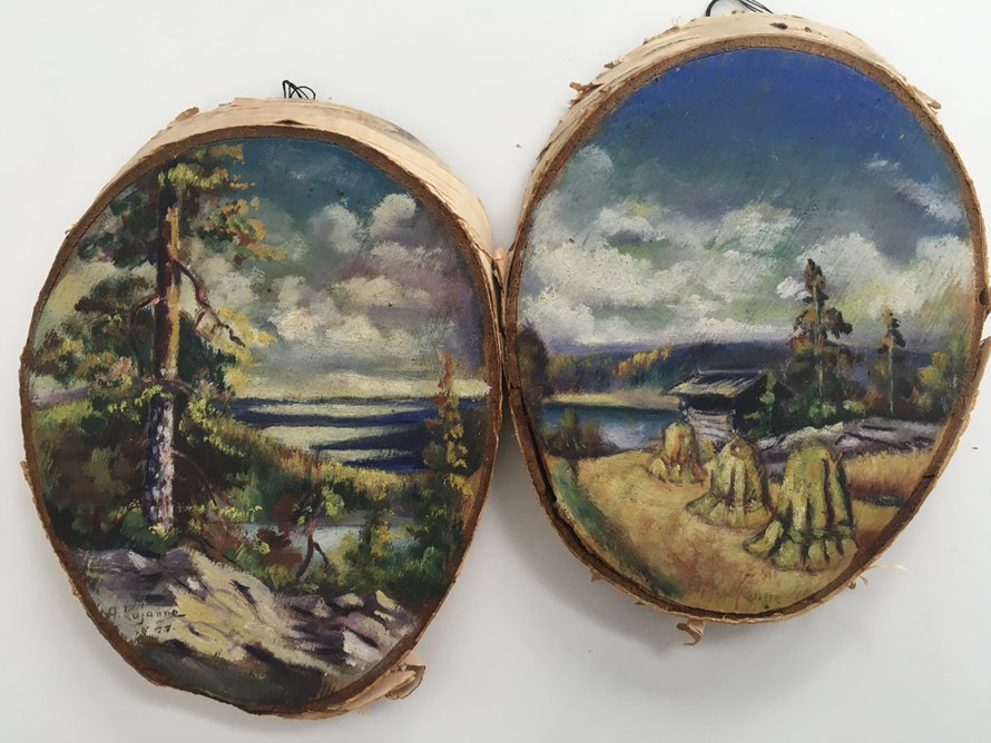 Enoni mukana kulkivat aina maalausvärit, myös sodassa. Välillä oli aikaa vaihtaa kivääri siveltimeen. Alustaksi kävi vaikka koivusta sahattu palanen.