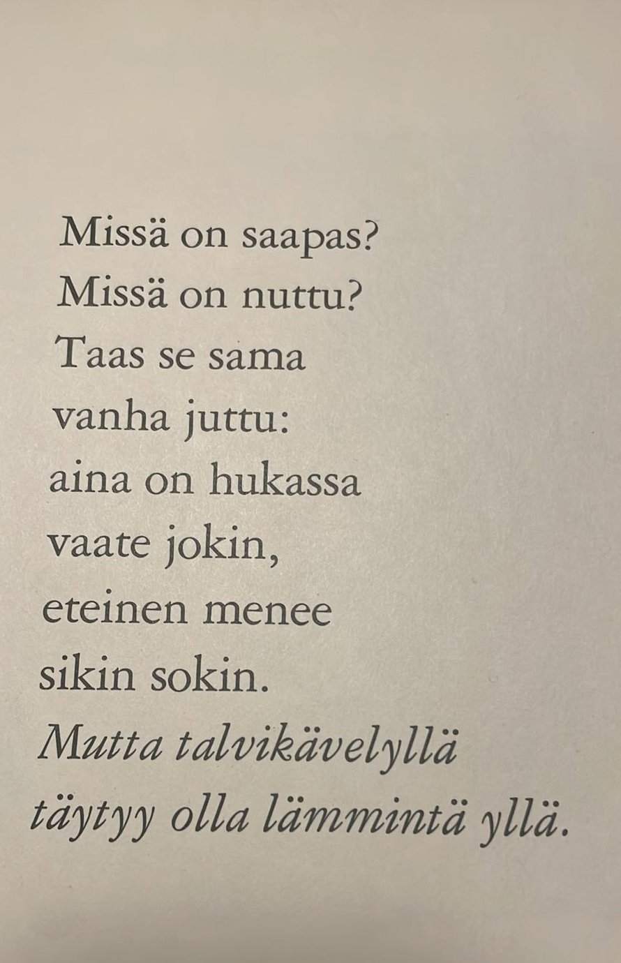 Ihana Talvinalle! Tätä luettiin omille lapsille niin paljon, että osattiin se ulkoa. Nyt kirja on lapsenlapsella eteläisellä pallonpuoliskolla. Siellä ei sada lunta, mutta runojen siivin voi siirtyä pohjoisen pakkasiin.