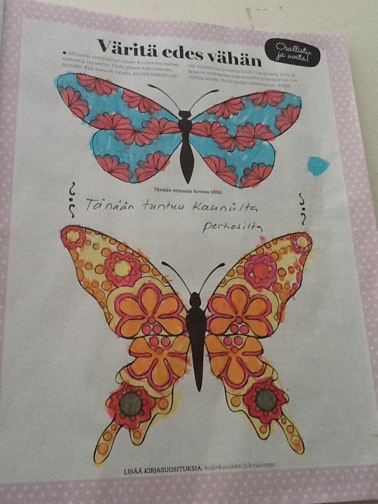 Mielenrauhaa aikuisten värityskirjasta - väritä perhoset ja voita! Tänään tuntuu kauniilta perhosilta 8.8.2015 klo 18:38